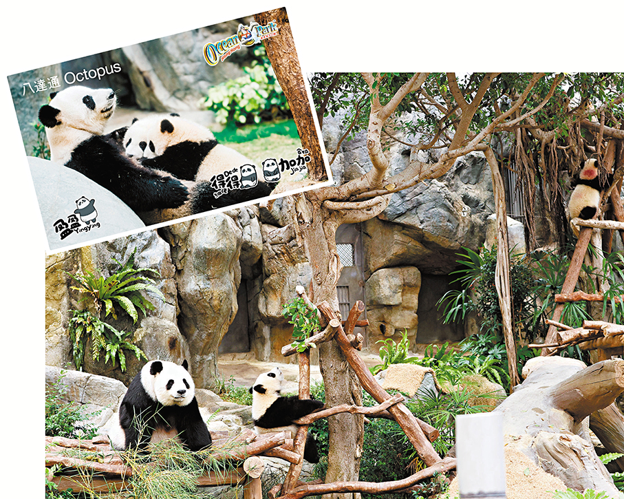 「盈盈」與「加加」及「得得」同框。左上圖為早前八達通公司與海洋公園攜手推出慈善紀念版動畫手機八達通卡面 。 資料圖片