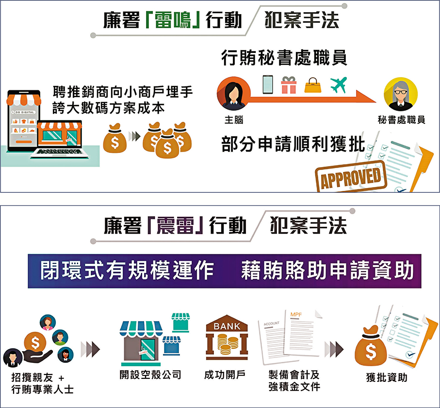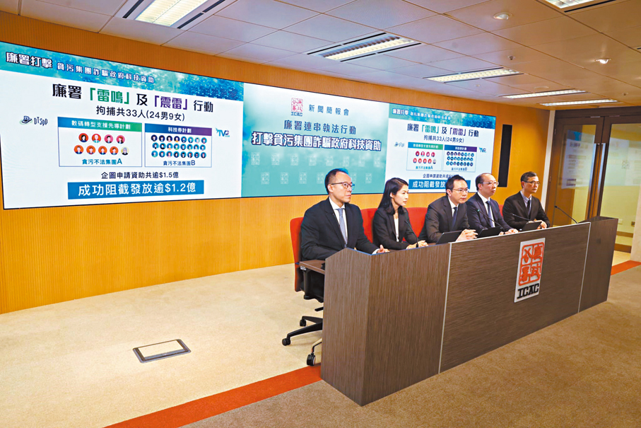 香港文匯報訊(記者 蕭景源)特區政府一直積極推動創新科技發展,並透過多項科技資助計劃協助業界借助科技加快數碼轉型步伐,提升長遠競爭力,惟有不法分子企圖詐騙資助。廉政公署早前接獲貪污投訴,經調查發現有不法分子以貪污及造假手段,申請「數碼轉型支援先導計劃」和「科技券」計劃的資助,詐騙公帑、謀取私利。遂於本月中先後採取代號「雷鳴」及「震雷」大型執法行動,偵破兩個詐騙集團拘捕33人。該兩個詐騙集團共提交約1,500宗申請企圖詐騙兩個計劃共逾1.5億元資助,但被及時堵截發放1.2億元,現正全力追回其餘資助。廉署強調,不會讓不法之徒「攞到一分錢利益」。