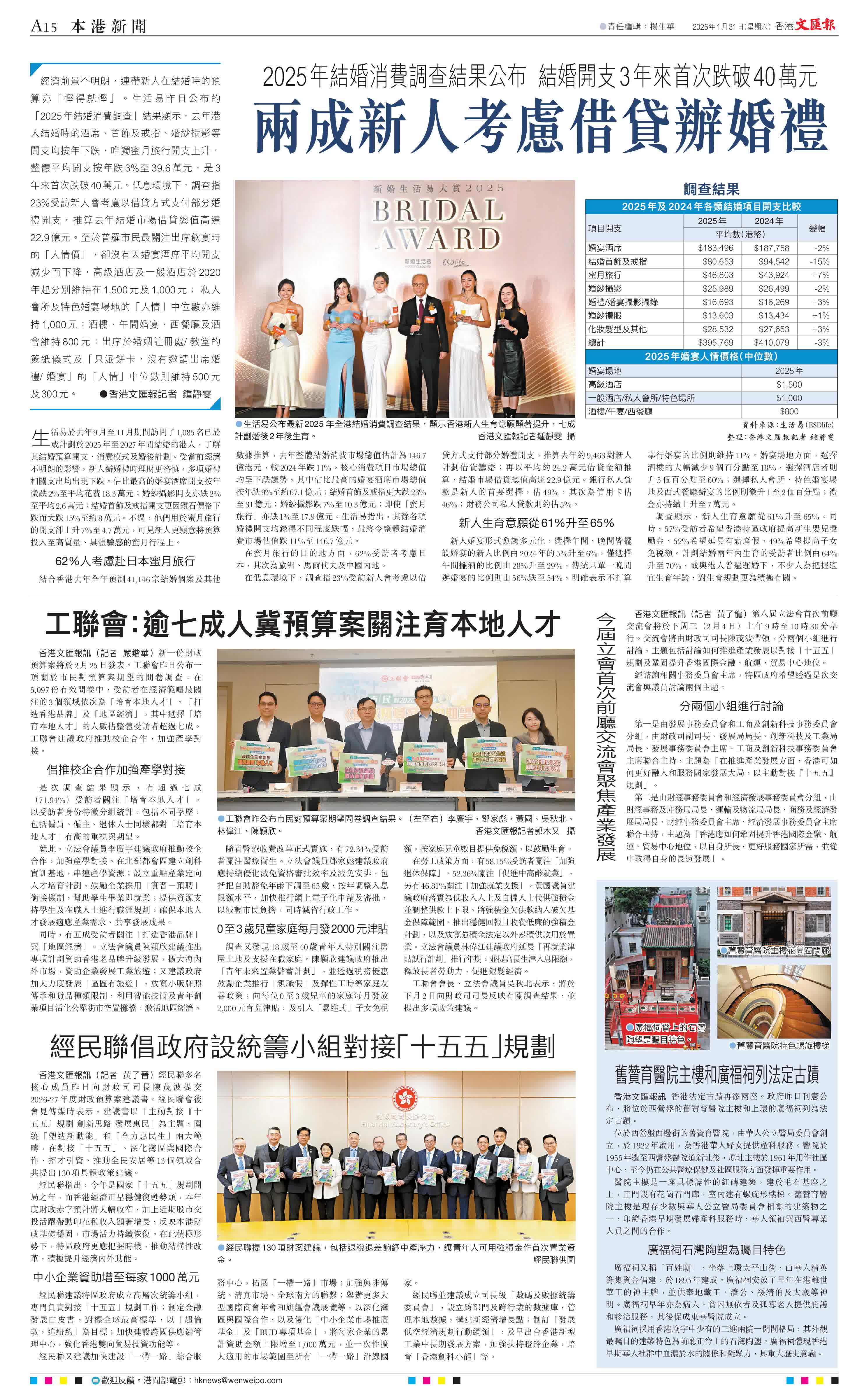 (香港文匯報記者 鍾靜雯)經濟前景不明朗,連帶新人在結婚時的預算亦「慳得就慳」。生活易昨日公布的「2025年結婚消費調查」結果顯示,去年港人結婚時的酒席、首飾及戒指、婚紗攝影等開支均按年下跌,唯獨蜜月旅行開支上升,整體平均開支按年跌3%至39.6萬元,是3年來首次跌破40萬元。低息環境下,調查指23%受訪新人會考慮以借貸方式支付部分婚禮開支,推算去年結婚市場借貸總值高達22.9億元。至於普羅市民最關注出席飲宴時的「人情價」,卻沒有因婚宴酒席平均開支減少而下降,高級酒店及一般酒店於2020年起分別維持在1,500元及1,000元;私人會所及特色婚宴場地的「人情」中位數亦維持1,000元;酒樓、午間婚宴、西餐廳及酒會維持800元;出席於婚姻註冊處/ 教堂的簽紙儀式及「只派餅卡,沒有邀請出席婚禮/ 婚宴」的「人情」中位數則維持500元及300元。