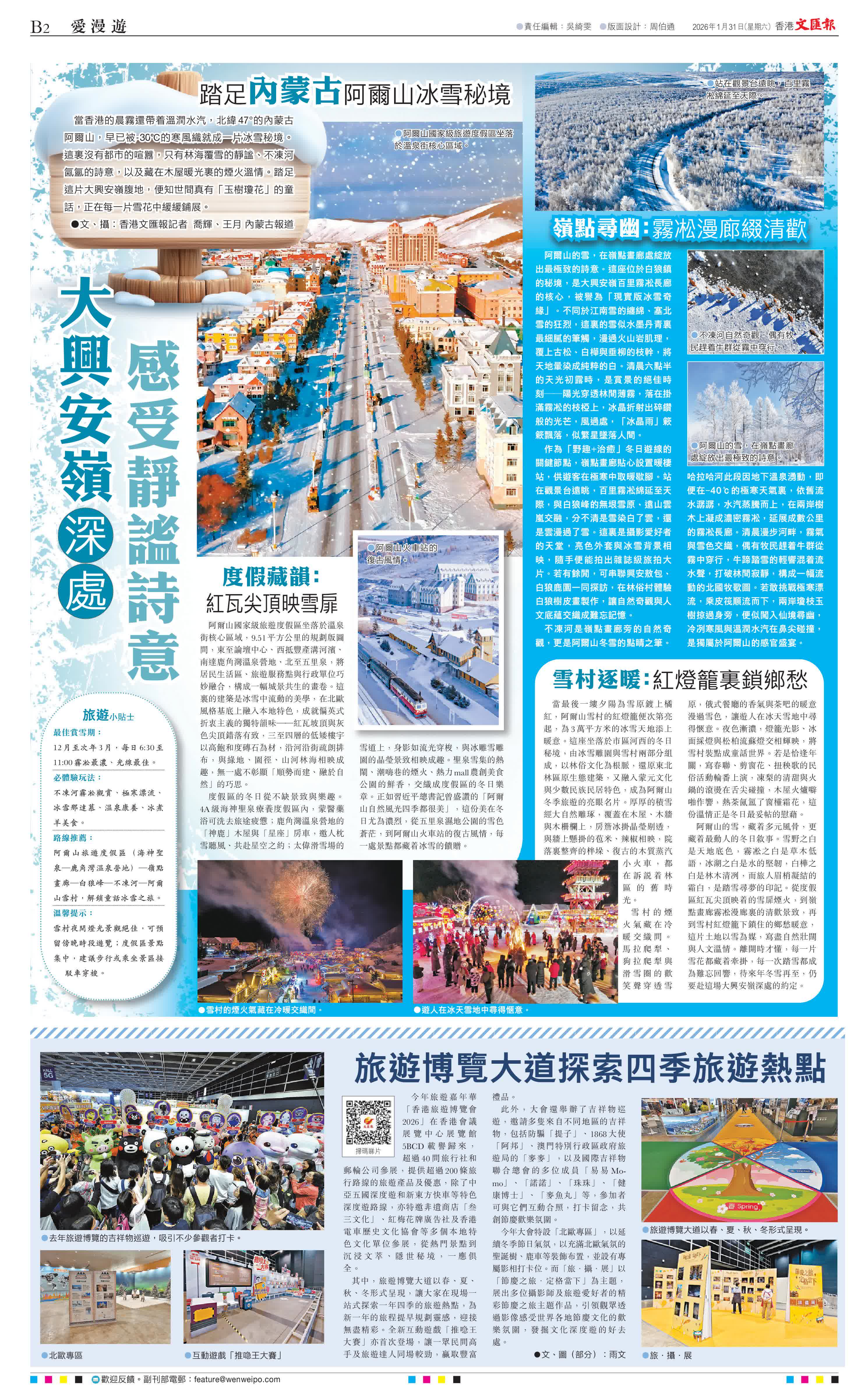 阿爾山的雪,藏着多元風骨,更藏着最動人的冬日敘事。雪野之白是天地底色,霧凇之白是草木低語,冰湖之白是水的堅韌,白樺之白是林木清冽,而旅人眉梢凝結的霜白,是踏雪尋夢的印記。從度假區紅瓦尖頂映着的雪扉煙火,到嶺點畫廊霧凇漫廊裏的清歡景致,再到雪村紅燈籠下鎖住的鄉愁暖意,這片土地以雪為媒,寫盡自然壯闊與人文溫情。離開時才懂,每一片雪花都藏着牽掛,每一次踏雪都成為難忘回響,待來年冬雪再至,仍要赴這場大興安嶺深處的約定。