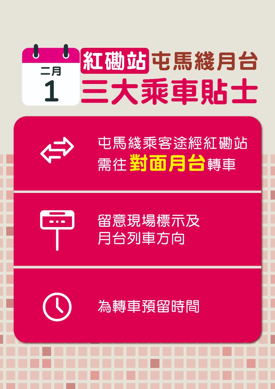香港文匯報訊(記者 蕭景源)港鐵今日(31日)宣布,為配合紅磡站至尖東站之間的路軌改道跟進工序,屯馬綫明日(2月1日)會實施特別服務安排。屯馬綫會繼續維持全綫服務,並行駛星期日的正常班次,各車站均可乘車,大部分乘客車程如常。港鐵公司提醒屯馬綫乘客,若車程途經紅磡站,便需在該站下車往對面月台轉車繼續行程。