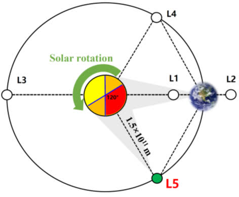 「羲和號」環繞地球運行,「羲和二號」則不是。「羲和號」科學與應用系統總設計師、南京大學天文與空間科學學院教授李川介紹,太陽和地球有5處引力平衡點,L1、L2、L3在日地連線上,L4、L5則在地球環繞太陽運行的軌道上,各自與太陽、地球構成邊長約1.5億公里的等邊三角形,如果將地球公轉方向視作「前方」,L5在地球的「身後」。