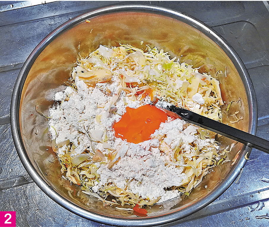 2. 碎芝士、天婦羅碎、韓國泡菜及蛋加入大碗內與椰菜絲拌勻;
