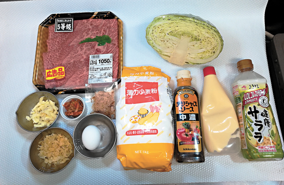 椰菜100克、碎芝士50克、天婦羅碎50克、韓國泡菜20克、薄切牛肉100克、蛋1隻、薄力小麥粉4湯匙、油1茶匙、日式中濃醬1湯匙、日式沙律醬1湯匙、鰹魚碎少許