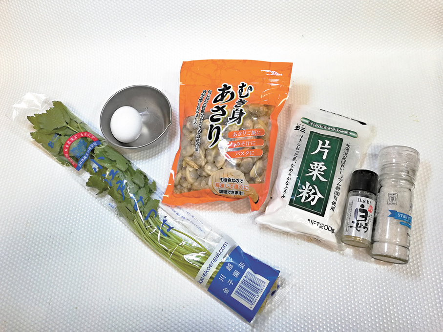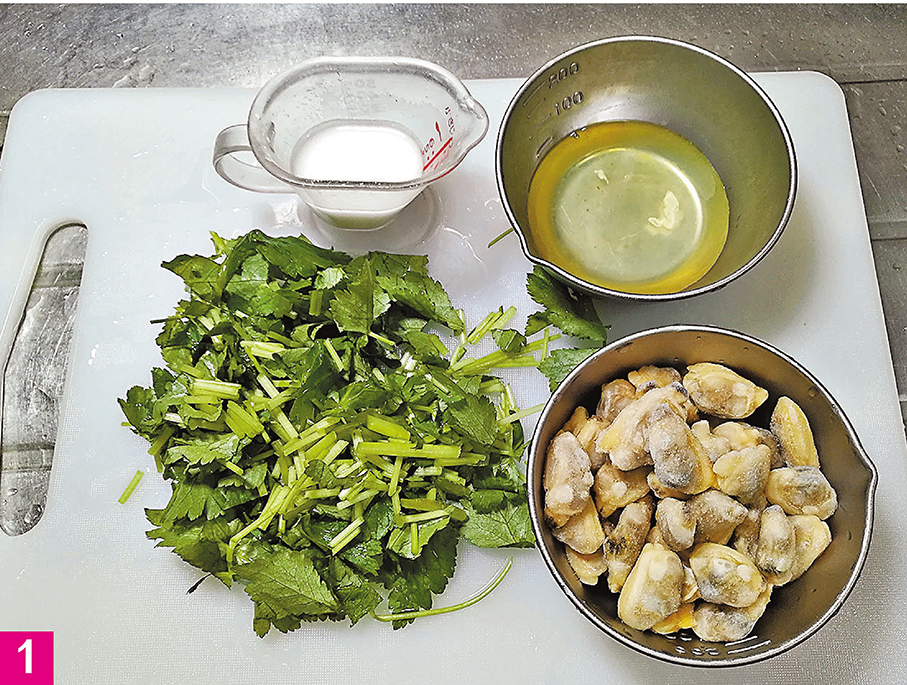 蜆肉100克、三葉30克、片栗粉1湯匙、蛋白1隻、鹽少許、胡椒粉少許