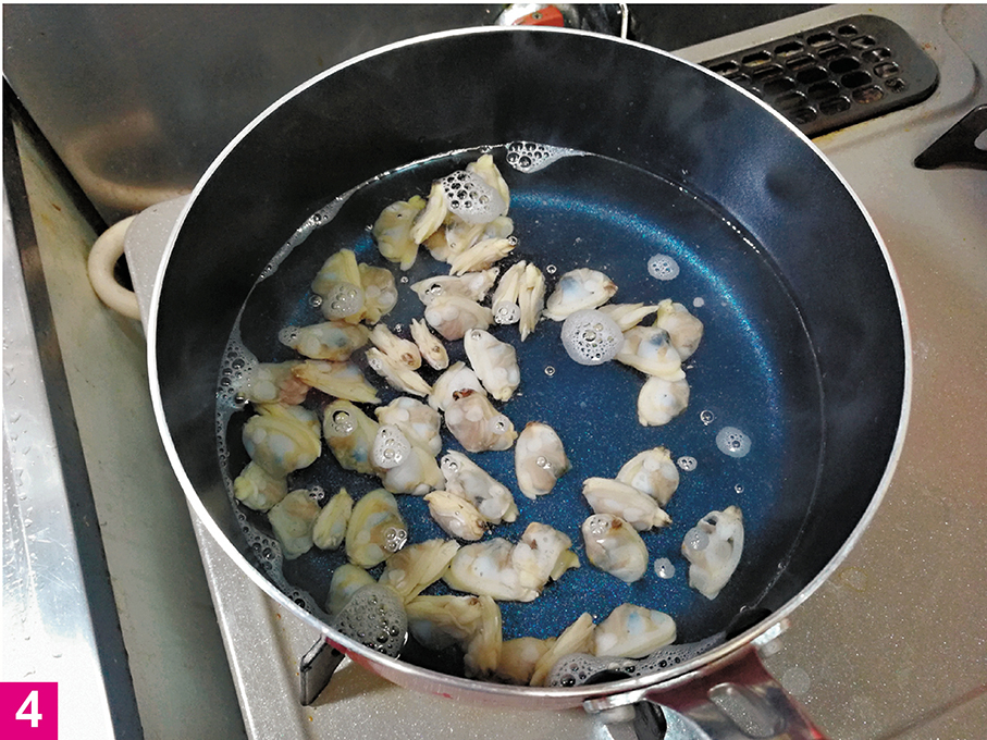 4. 將蜆肉加入鍋內、轉小火煮3分鐘,水再沸騰後,加入片栗粉水拌勻;