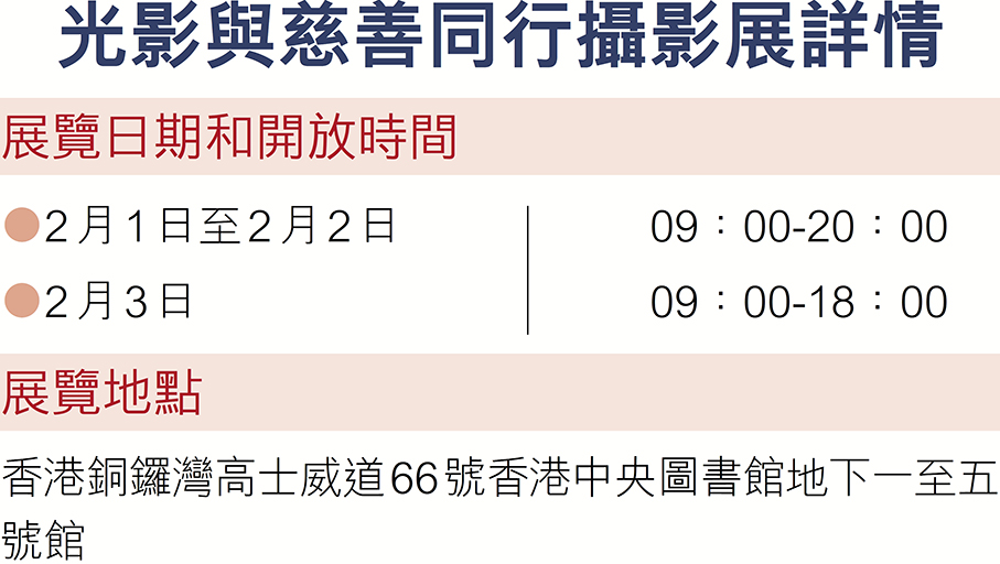 香港文匯報訊(記者 鍾靜雯)心連大地攝影會由上周五起一連五日在香港中央圖書館舉辦「光影與慈善同行— 陳俊濠永遠榮譽會長攝影藝術暨會員作品展」,展出陳俊濠和心連大地攝影會會員逾430幅攝影作品和工作照。特區政府政務司司長陳國基昨日在展覽開幕禮上致辭時表示,今次展出的每一幅作品,不單記錄了山河美景,也見證了發展的歷程、人民的生活。