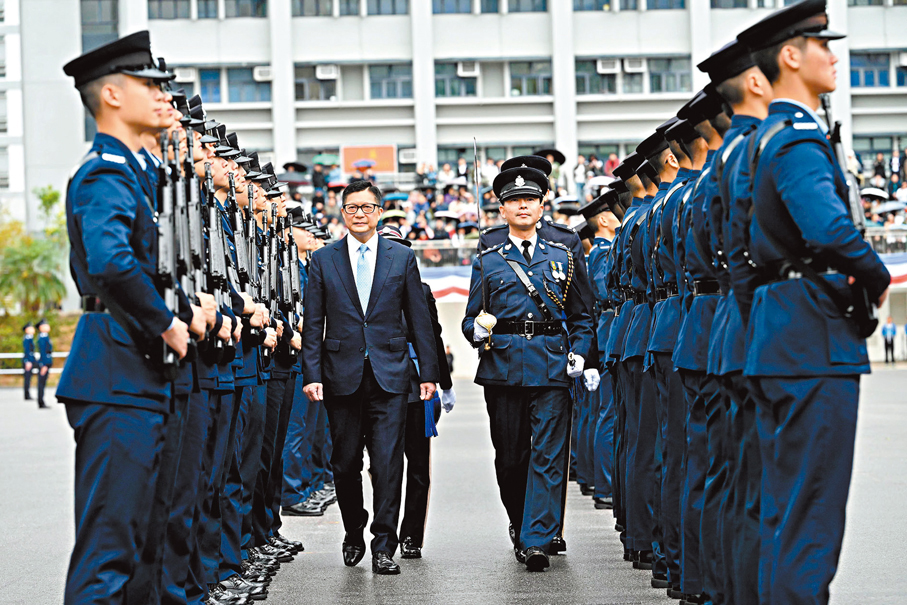 香港文匯報訊(記者 黃子晉)香港警察學院結業會操昨日舉行,共有15名見習督察及248名學警畢業。擔任檢閱官的特區政府保安局局長鄧炳強致辭時表示,時代和環境在變,罪案模式和查案方式亦在變,不變的是警察的使命、對國家和香港的忠誠、維護法治的決心,以及服務社會的承諾。警務人員每日面對很多未知和挑戰,需具備「鐵骨、仁心、慧眼」三要素。