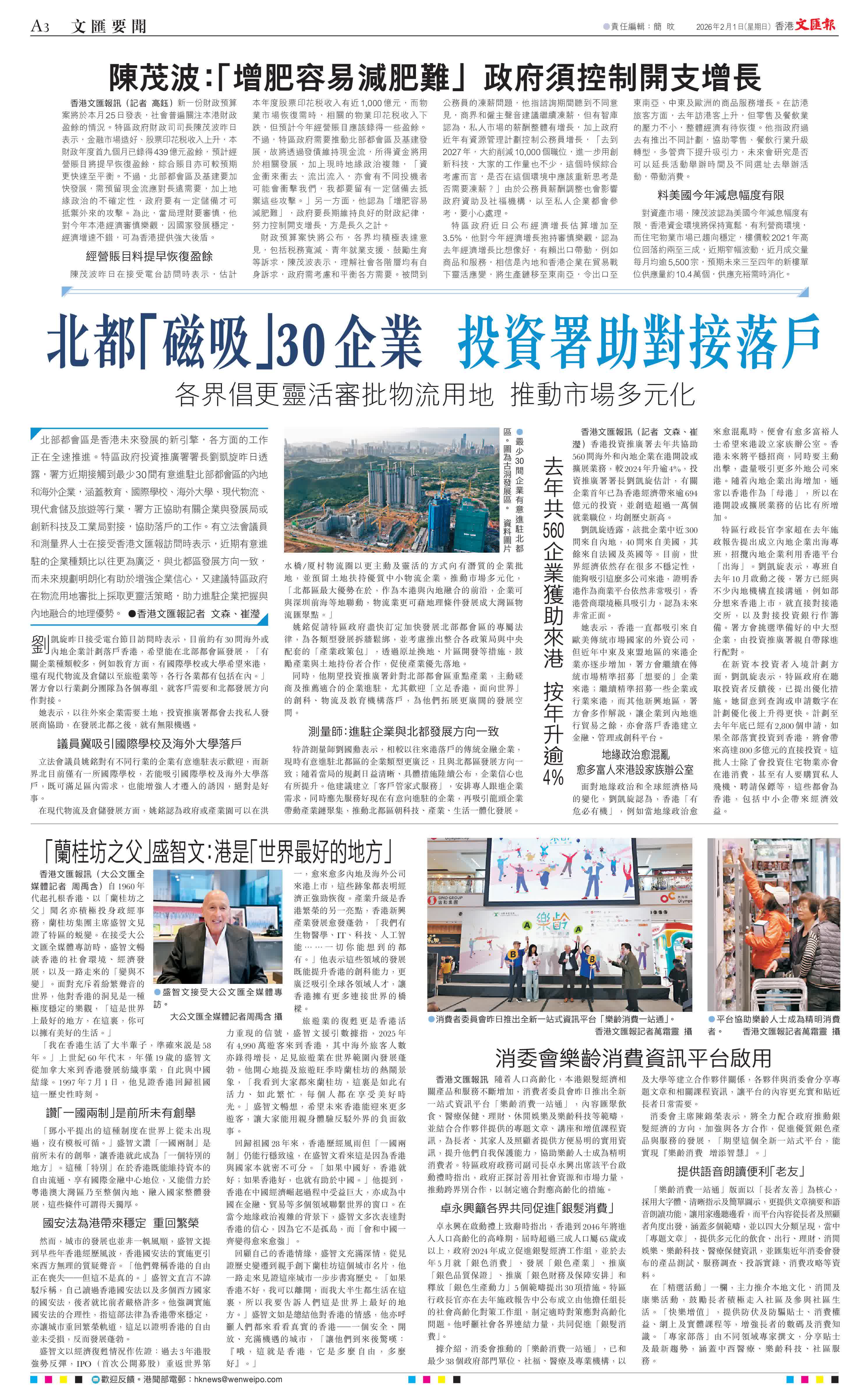 同時,他期望投資推廣署針對北部都會區重點產業,主動磋商及推薦適合的企業進駐,尤其歡迎「立足香港,面向世界」的創科、物流及教育機構落戶,為他們拓展更廣闊的發展空間。