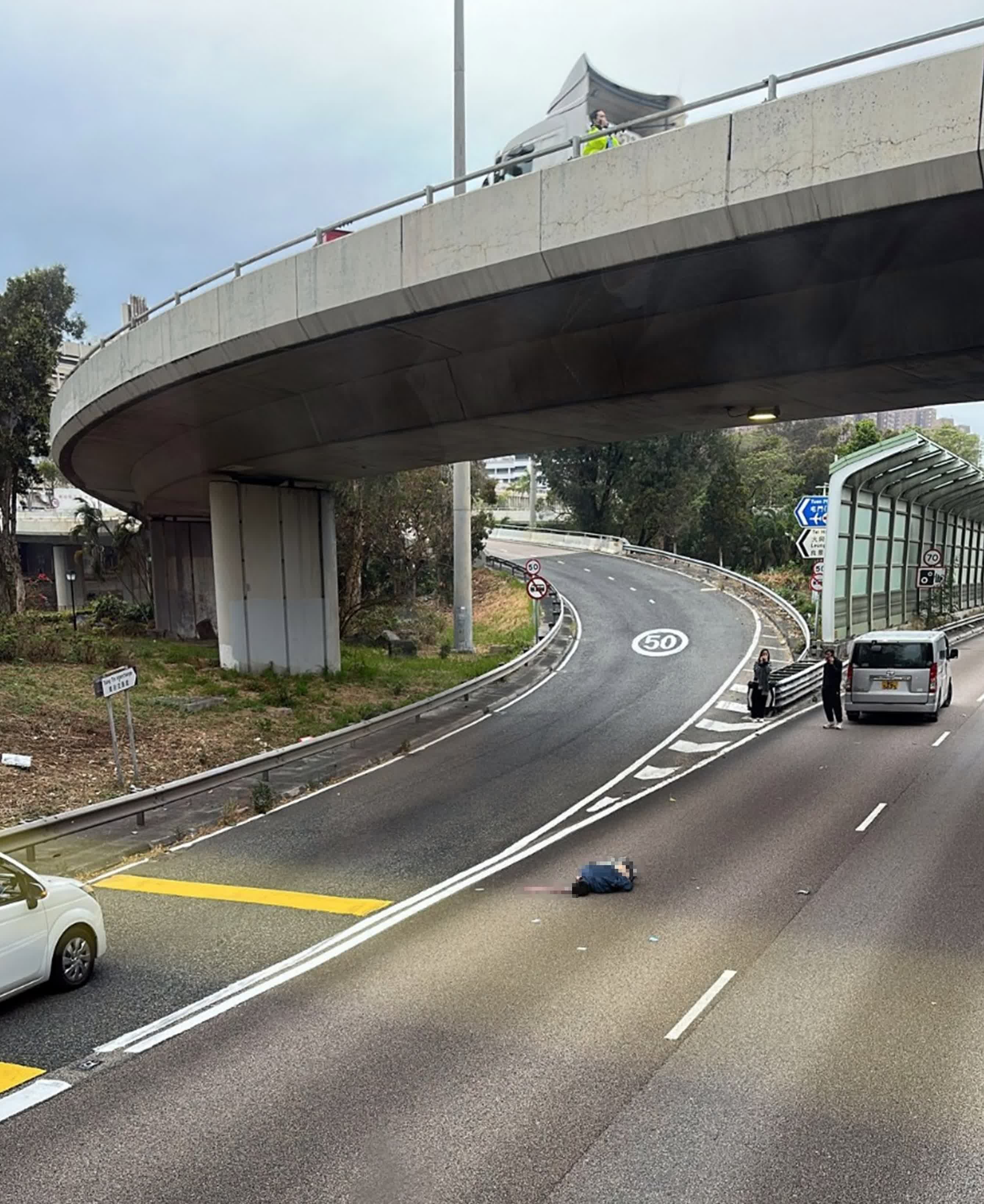 香港文匯報訊(記者 蕭景源)上周五(30日)下午,一名男子被發現浴血倒臥屯門公路近青田交匯處往元朗方向路面,經送院搶救後不治。據悉,事主事前駕電單車沿青田交匯處天橋行駛,其間疑意外失事飛墮至橋下屯門公路。今日(1日)上午11時許,約10多名死者親友在場路祭,在道士帶領下掛起一件屬於死者的衣服進行招魂儀式,一眾親友手執香燭等祭品,現場瀰漫一片愁雲慘霧。