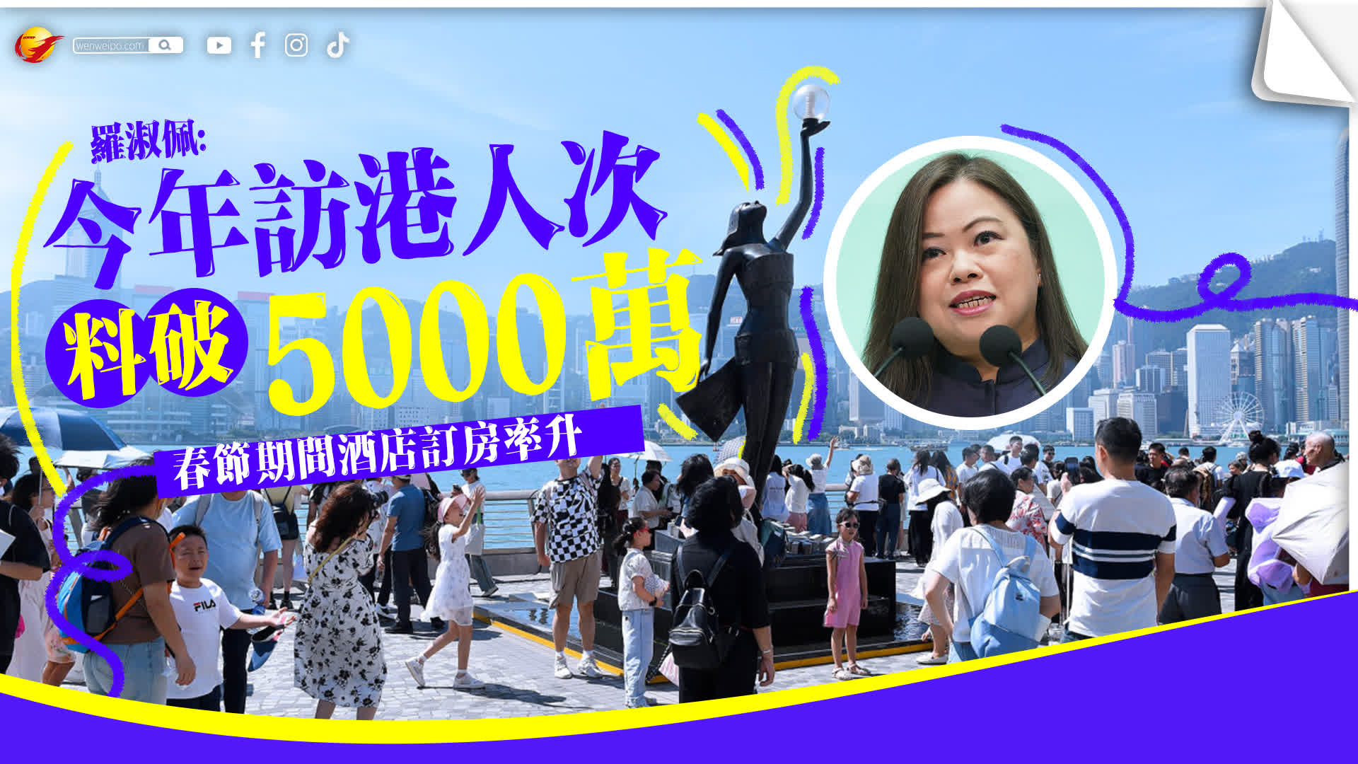 農曆春節將至,文化體育及旅遊局局長羅淑佩表示,農曆春節期間本港活動豐富,內地又有一連9日長假,因此對旅遊市道感到樂觀,並有信心今年訪港旅客突破5000萬人次。