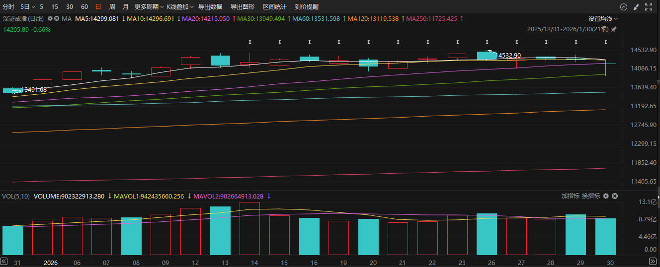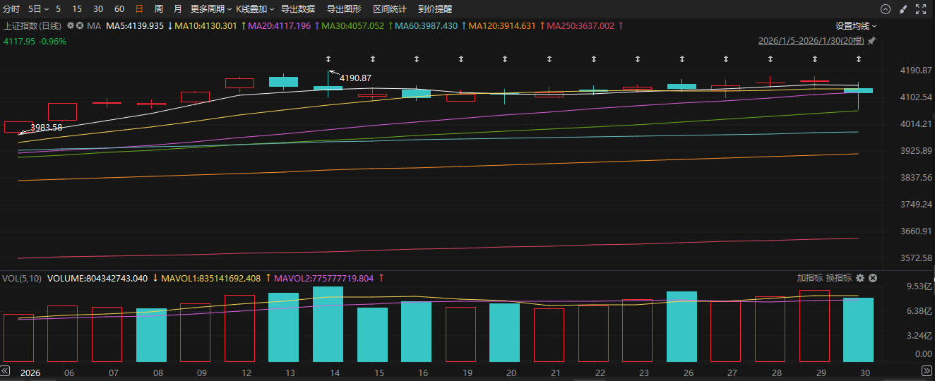 1月30日,上證指數報4117.95點,下跌0.96%;深證成指報14253.74點,下跌0.66%;創業板指報3332.78點,逆勢上漲1.27%。