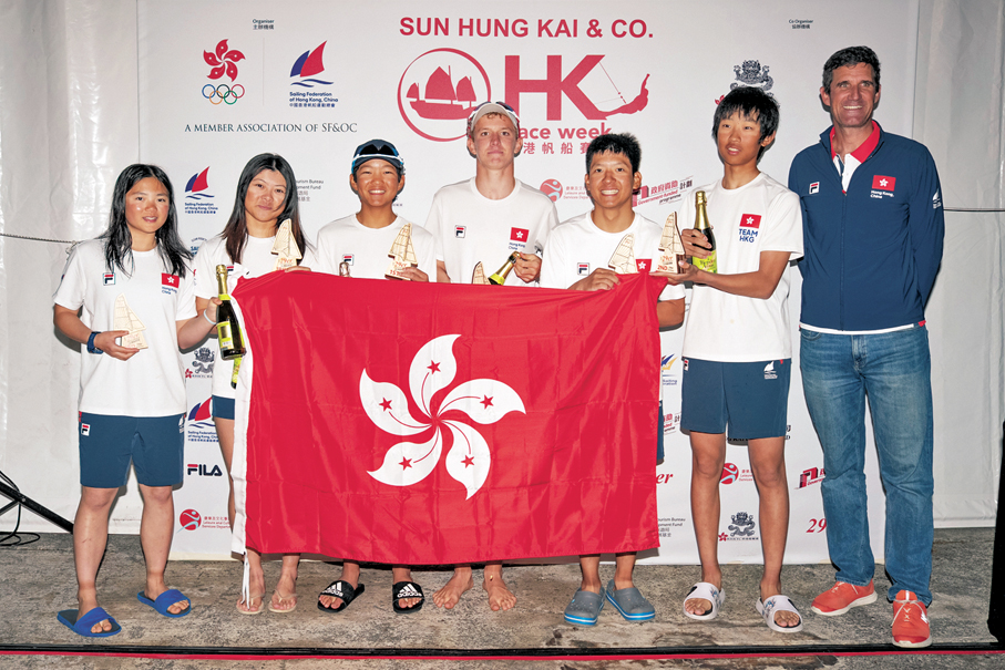 為期六日的「新鴻基公司香港帆船賽週」暨第四屆「29er亞洲帆船錦標賽」於周日(1日)圓滿結束,其中「29er亞洲帆船錦標賽」三甲由港隊代表包辦,冠軍得主為普令行(右四)和喬㵆鏗(左三),亞軍為韓牧峰(右二)和陳宏立(右三),而季軍則為江芷棋(左一)和黃曦慧。 公關圖片
