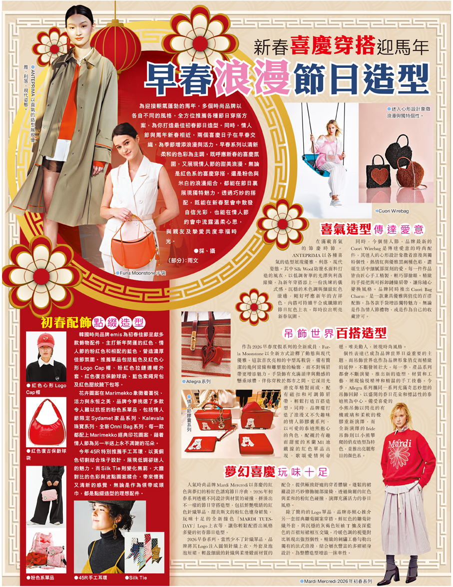 為迎接朝氣蓬勃的馬年,多個時尚品牌以各自不同的風格,全方位推薦各種節日穿搭方案,為你打造最佳初春節日造型。同時,情人節與馬年新春相近,兩個喜慶日子在早春交織,為季節增添浪漫與活力。早春系列以清新柔和的色彩為主調,既呼應新春的喜慶氛圍,又展現情人節的甜美浪漫。無論是紅色系的喜慶穿搭,還是粉色與米白的浪漫組合,都能在節日裏展現獨特魅力。透過巧妙的搭配,既能在新春聚會中散發自信光彩,也能在情人節約會中流露溫柔心思,與親友及摯愛共度幸福時光。