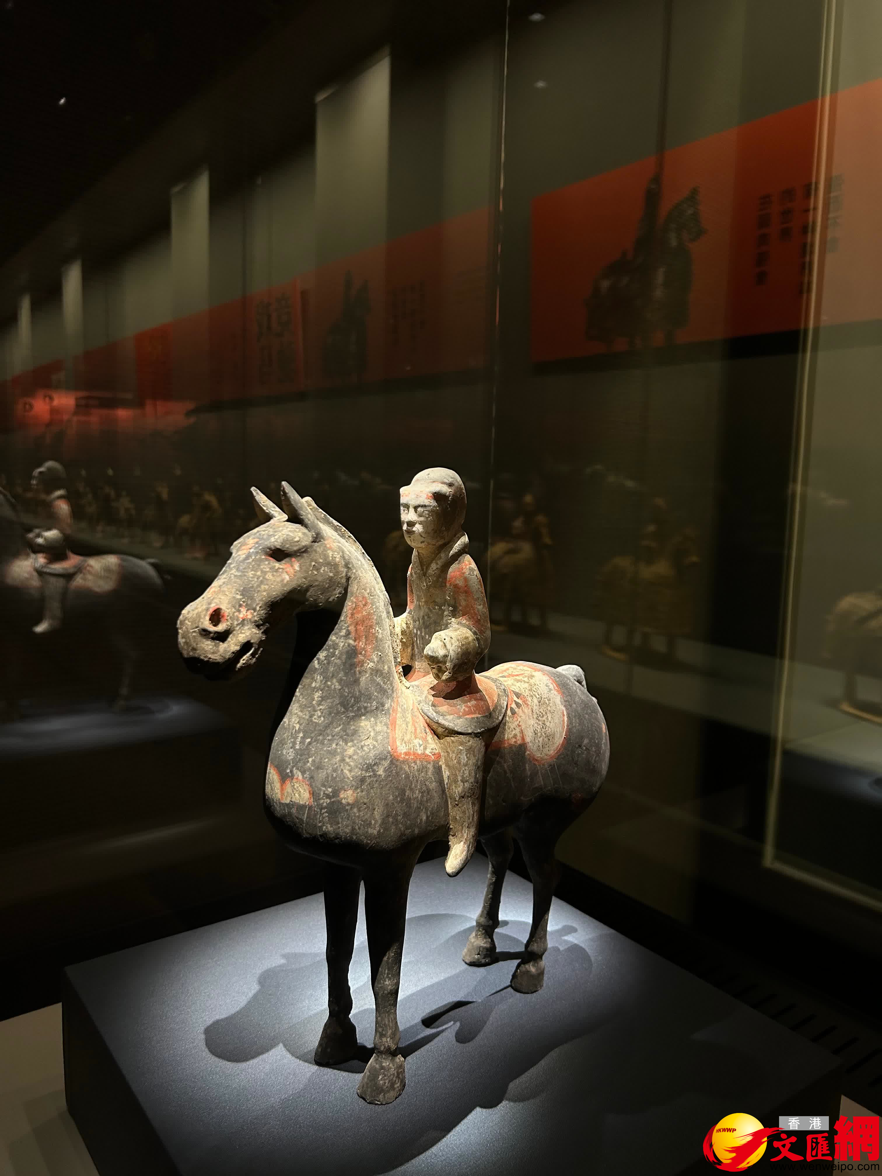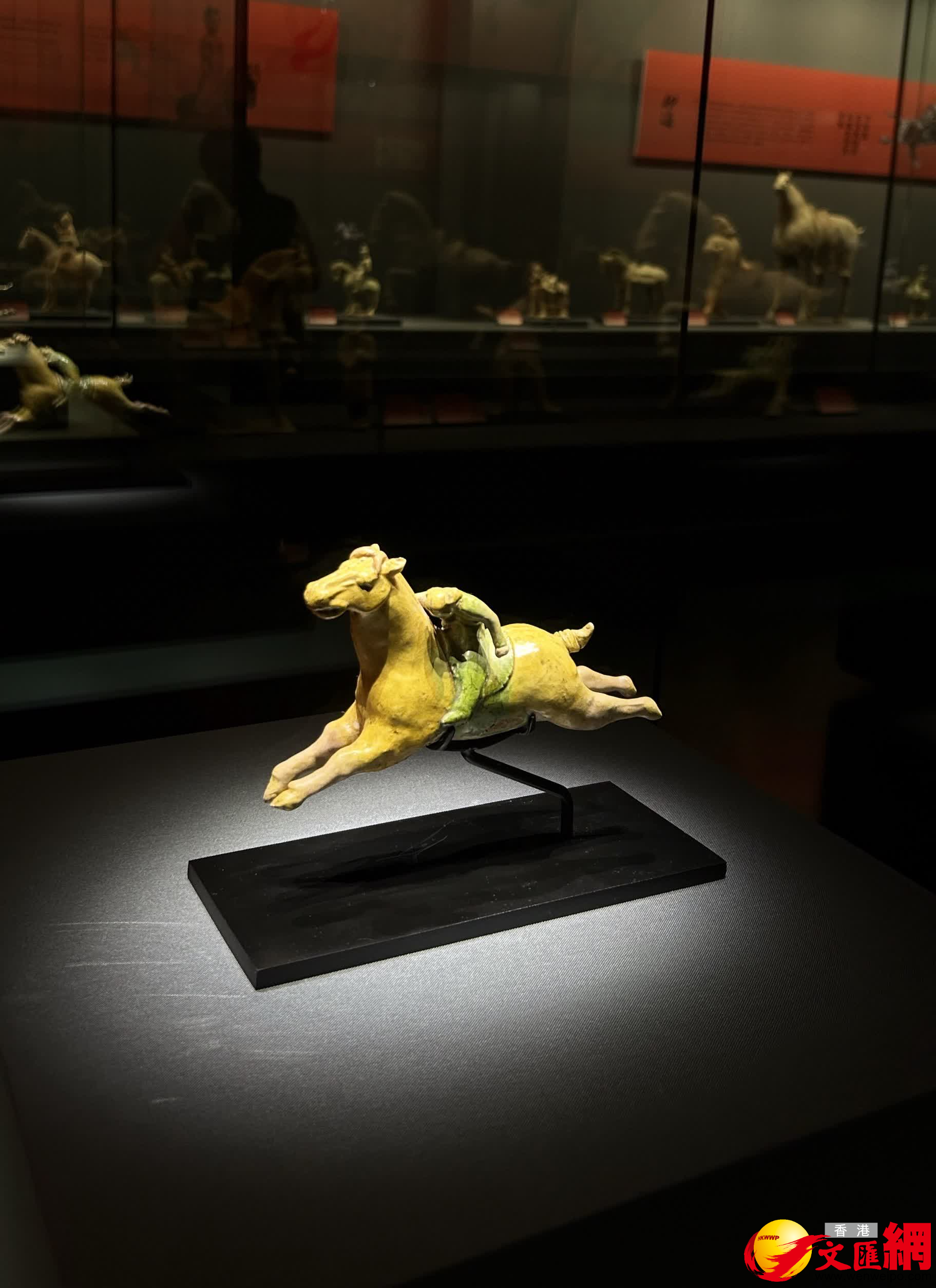 展廳之內,百餘件珍品引得觀眾駐足細賞、流連不去。十六國褐釉馬鎧俑披甲凜立,馬鐙細節清晰可辨,盡顯古代戰場的雄渾氣勢;漢代綠釉勇士騎飛奔馬俑三蹄騰空,武士神情冷峻,定格古代驛傳信使星夜疾馳的鮮活瞬間;唐代三彩打馬球俑靈動傳神,駿馬騰躍、球手俯身,將盛唐馬球運動的熱烈場景完整復刻,再現盛世風雅。