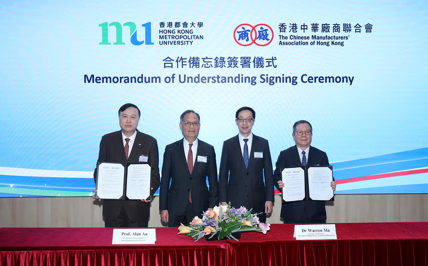 簽署儀式在都大校長林群聲及廠商會會長盧金榮見證下,由都大副校長(策略規劃)區啟明與廠商會常務副會長馬介欽共同簽署。