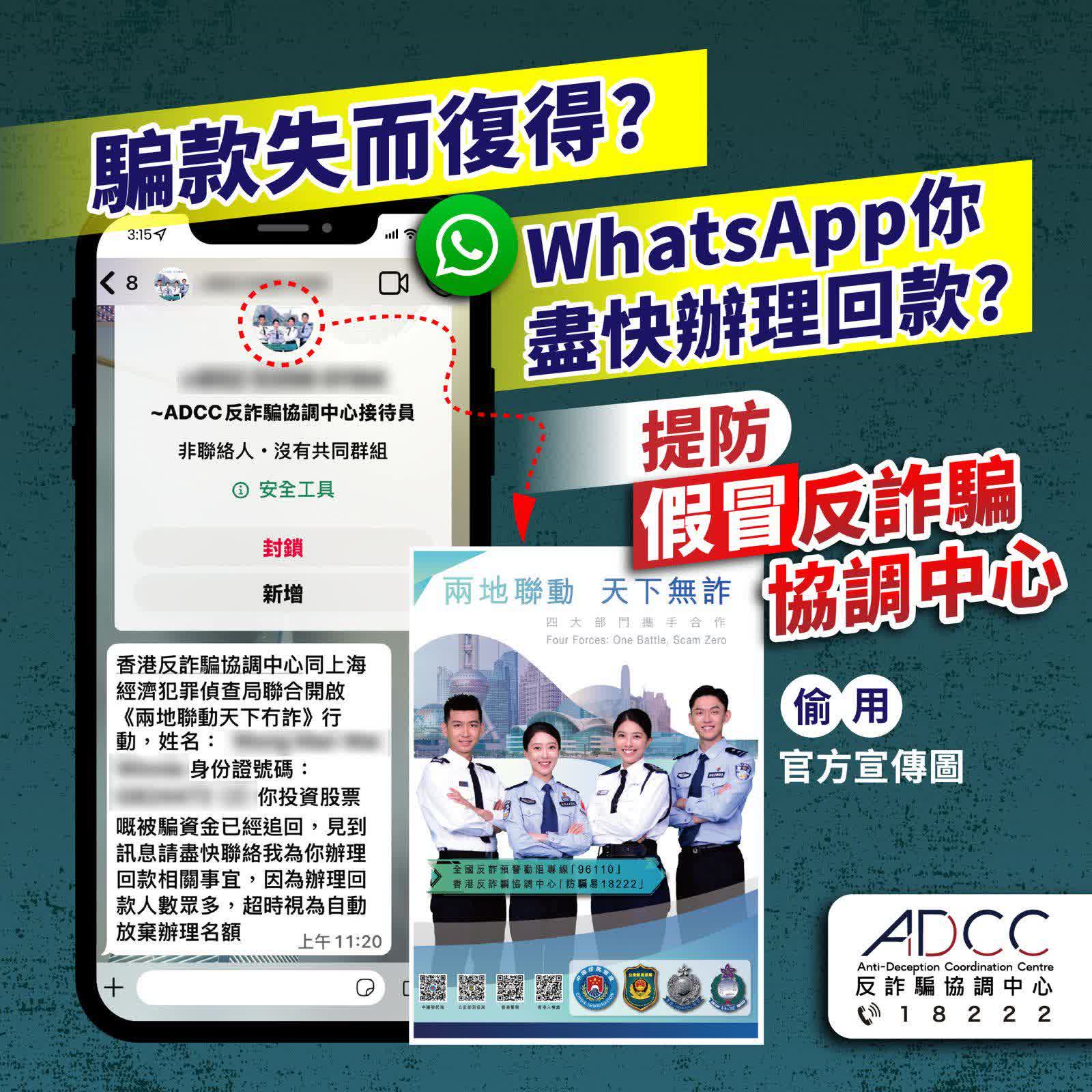 香港文匯報訊(記者 蕭景源)警方今日(3日)在社交平台帖文,指近日有騙徒冒充反詐騙協調中心(ADCC),以WhatsApp聯絡曾受騙的市民,聲稱「中心已成功追回被騙款項,請盡快聯絡辦理退款,否則視作自動放棄。」騙徒為求逼真,更盜用官方「兩地聯動,天下無詐」的宣傳圖同口號,以增加可信度,市民切勿相信;如懷疑受騙,即打「防騙易18222」熱線查詢。