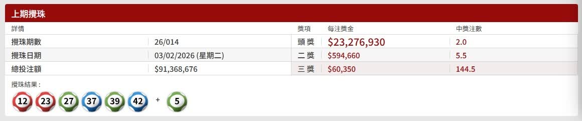 頭獎2注中,每注獎金$23,276,930;二獎5.5注中,每注獎金$594,660;三獎144.5注中,每注獎金$60,350。