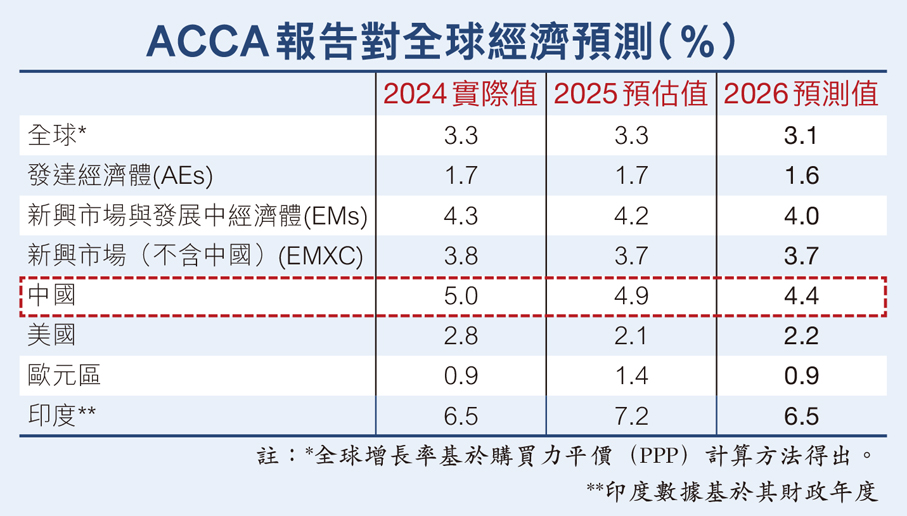 特許公認會計師公會(ACCA)發布最新全球經濟展望報告,預測在寬鬆貨幣政策、主要經濟體財政刺激措施及人工智能熱潮持續推動下,2026年全球經濟預計將保持平穩增長,全球國內生產總值(GDP)增長率約為3%,大致與去年持平。中國經濟增長率預計為4.4%,較過去放緩但仍高於全球平均水平。報告引述分析指出,中國經濟的挑戰主要在正經歷結構性轉型,需要提高消費在其經濟中的比重。