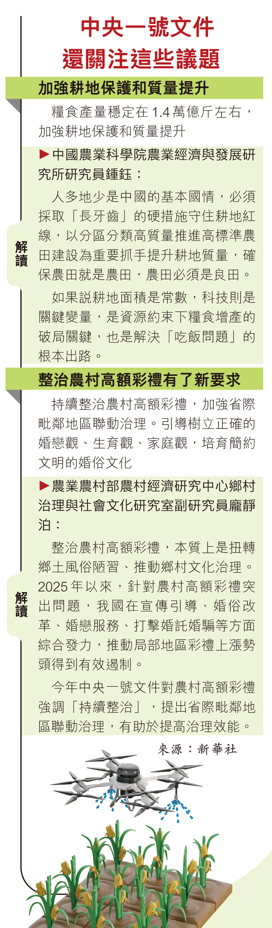 2026年中央一號文件《中共中央 國務院關於錨定農業農村現代化 扎實推進鄉村全面振興的意見》3日發布,這是中共十八大以來第14個指導「三農」工作的中央一號文件,也是「十五五」首個中央一號文件,對錨定農業農村現代化、扎實推進鄉村全面振興進行了部署。香港文匯報記者注意到,文件首次系統性部署實施常態化精準幫扶,要求健全常態化幫扶政策體系,守牢不發生規模性返貧致貧底線。此外,文件將農民增收擺在十分突出的位置,強調積極促進農民穩定增收。