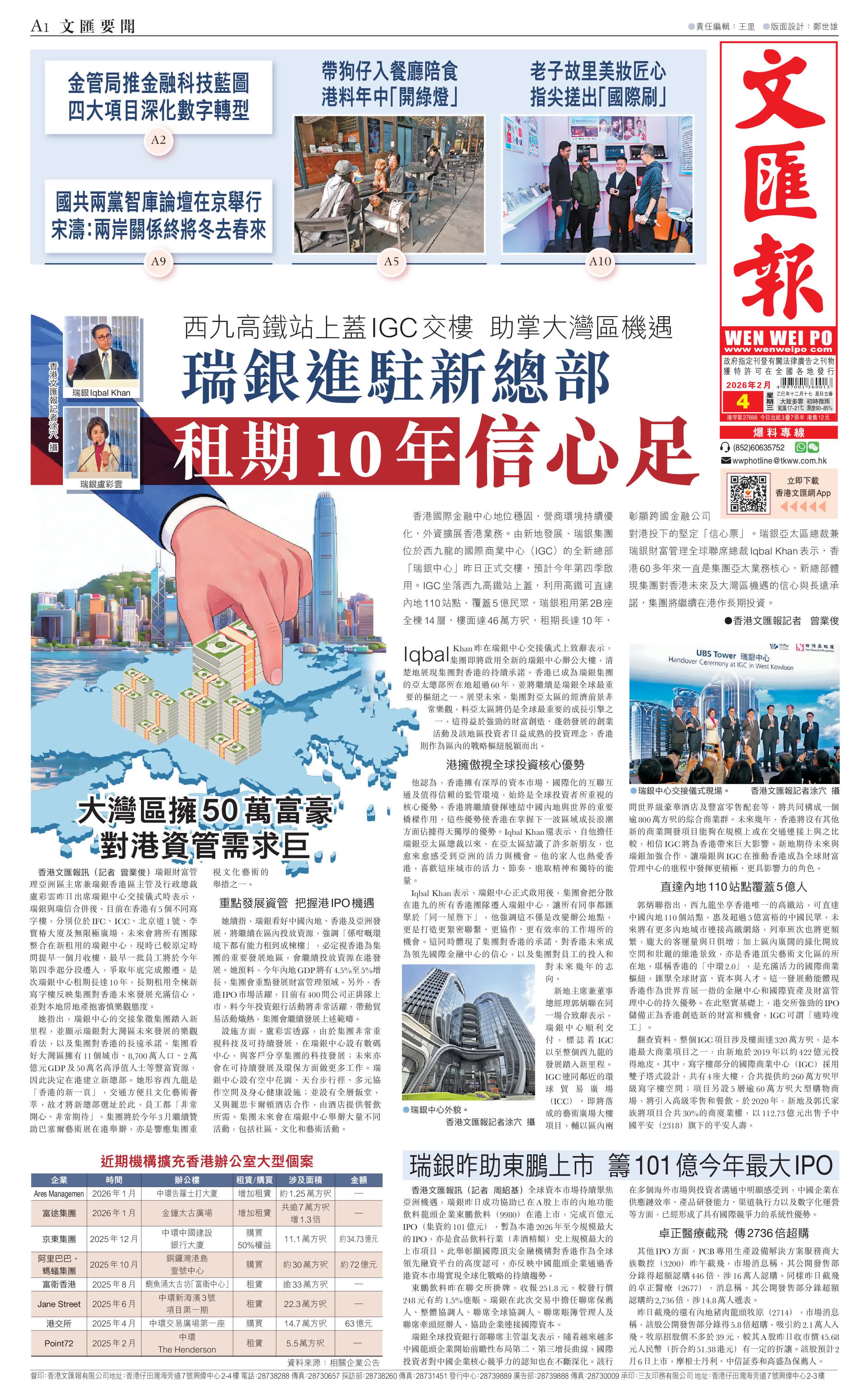 (香港文匯報記者 曾業俊)香港國際金融中心地位穩固,營商環境持續優化,外資擴展香港業務。由新地發展、瑞銀集團位於西九龍的國際商業中心(IGC)的全新總部「瑞銀中心」昨日正式交樓,預計今年第四季啟用。IGC坐落西九高鐵站上蓋,利用高鐵可直達內地110站點、覆蓋5億民眾,瑞銀租用第2B座全棟14層,樓面達46萬方呎,租期長達10年,彰顯跨國金融公司對港投下的堅定「信心票」。瑞銀亞太區總裁兼瑞銀財富管理全球聯席總裁Iqbal Khan表示,香港60多年來一直是集團亞太業務核心,新總部體現集團對香港未來及大灣區機遇的信心與長遠承諾,集團將繼續在港作長期投資。