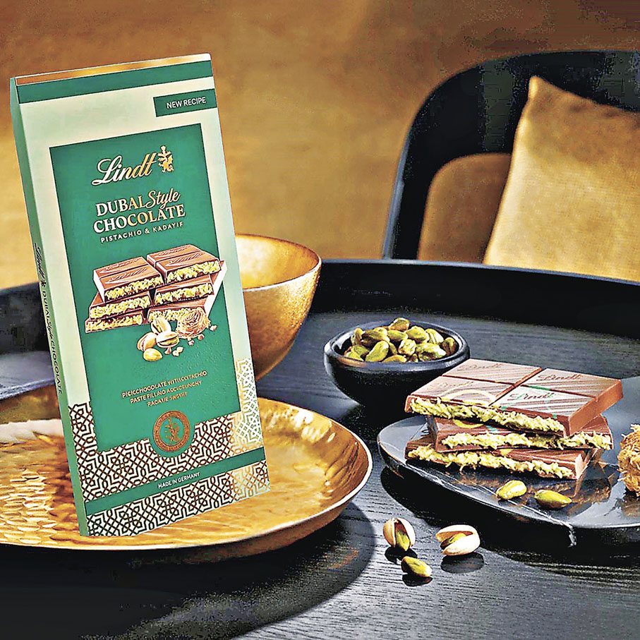 除了麻糬製品,迪拜朱古力本身也很值得「甜品控」們一試。其實本港有售多款品牌的迪拜朱古力,從高級酒店的出品,到超市就能輕鬆買到的親民選擇,總有一款啱你口味。其中,由法國著名甜點品牌 DALLOYAU與香港米芝蓮二星主廚Eric Räty攜手打造的朱古力品牌「Da Choco 」,就有一款開心果脆牛奶朱古力(售價238元),餡料沾滿由頂級開心果製成的濃郁開心果醬,外層是幼滑的法國Valrhona牛奶朱古力。Lindt & Sprüngli推出「瑞士蓮杜拜式開心果朱古力」,將瑞士蓮的招牌瑞士牛奶朱古力融合濃郁開心果,內含45%開心果夾心餡、開心果粒和杏仁脆片,最後再混合中東酥絲,一啖幾重層次,在各大超市都有售。
