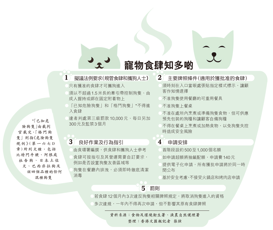 (香港文匯報記者 張弦、張茗)為打造寵物友善的氛圍,香港特區政府擬於今年首季向立法會提交法例的修訂建議,以容許狗隻進入合資格的食肆。政府發言人透露,今年年中將推出首階段食肆申請,名額500個至1,000個,但食肆及狗主必須遵守多項要求,包括需使用不超過1.5米長牽引繩控制狗隻、不容許狗隻使用餐廳的可重用餐具及上餐桌等,但火鍋店及烤肉店不符申請資格。政府其後將視乎社會接受程度和需求,再推出第二批申請名額。餐飲業反應正面,多間餐廳有意申請,新措施不僅滿足寵物主人需求,也有不少旅客表示,將來有意到寵物餐廳用膳,認同「寵物經濟」大有可為。