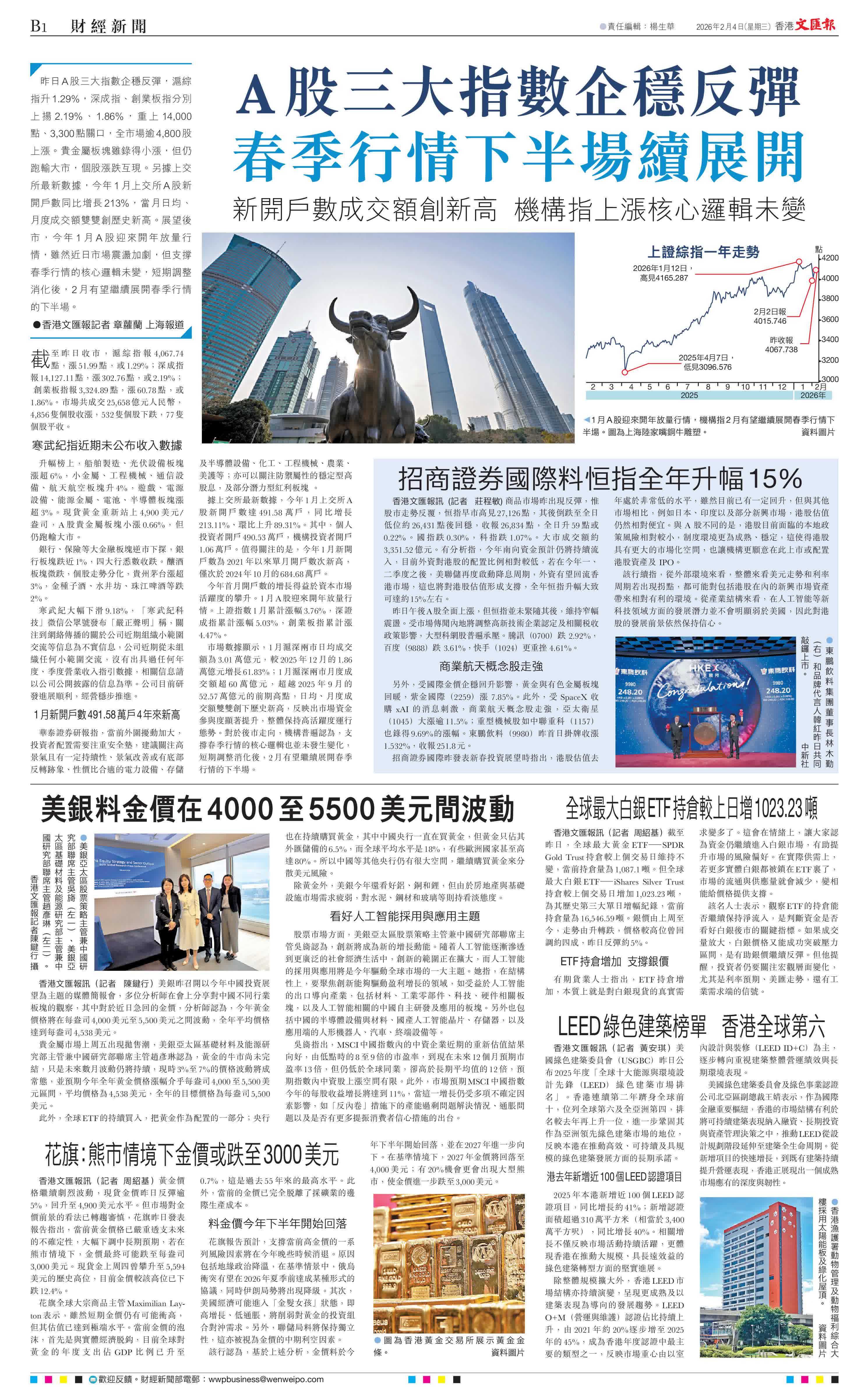 股票市場方面,美銀亞太區股票策略主管兼中國研究部聯席主管吳旖認為,創新將成為新的增長動能。隨着人工智能逐漸滲透到更廣泛的社會經濟生活中,創新的範圍正在擴大,而人工智能的採用與應用將是今年驅動全球市場的一大主題。她指,在結構性上,要聚焦創新能夠驅動盈利增長的領域,如受益於人工智能的出口導向產業,包括材料、工業零部件、科技、硬件相關板塊,以及人工智能相關的中國自主研發及應用的板塊。另外也包括中國的半導體設備與材料、國產人工智能晶片、存儲器,以及應用端的人形機器人、汽車、終端設備等。