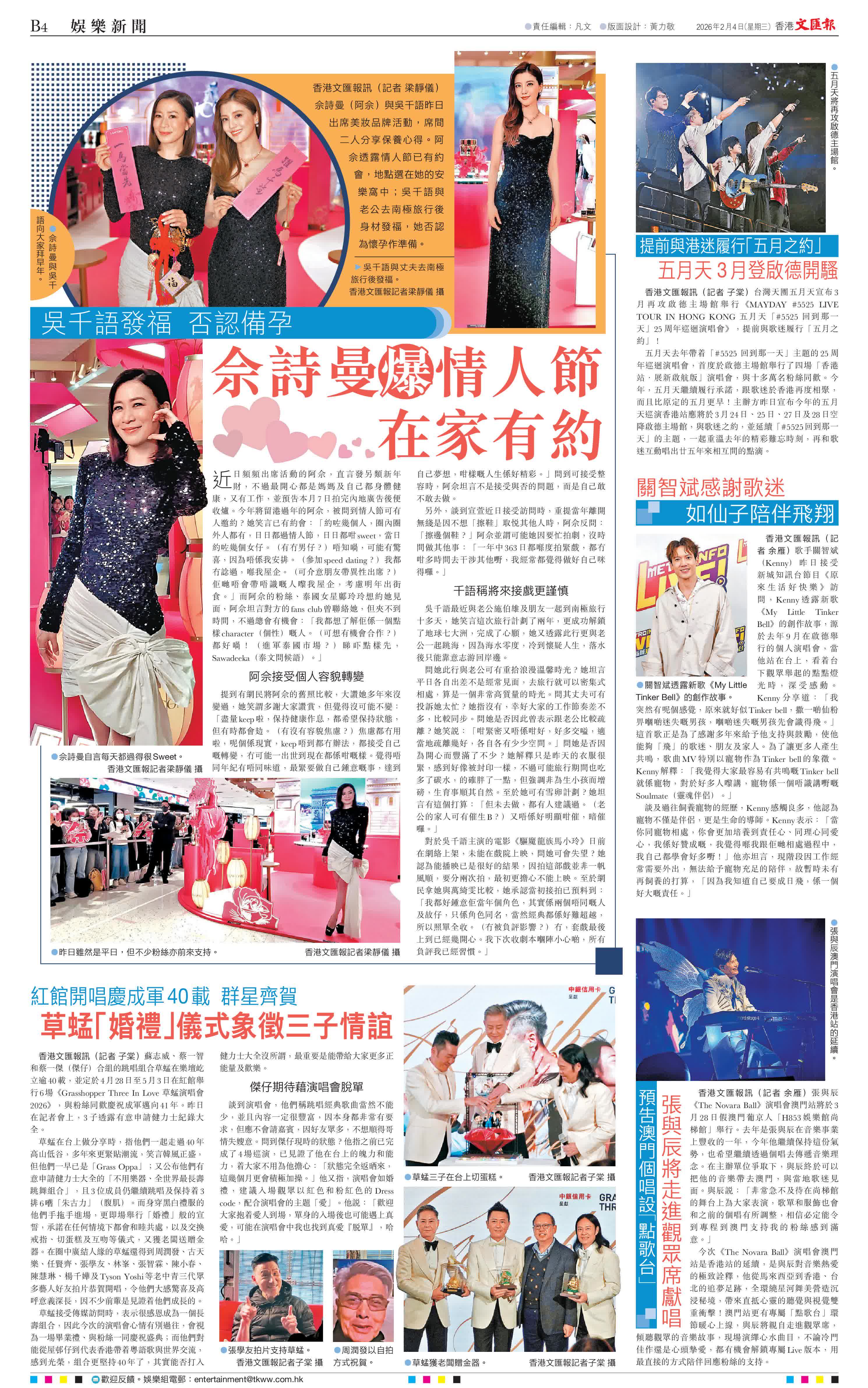 近日頻頻出席活動的阿佘,直言發另類新年財,不過最開心都是媽媽及自己都身體健康,又有工作,並預告本月7日拍完內地廣告後便收爐。今年將留港過年的阿佘,被問到情人節可有人邀約?她笑言已有約會:「約咗幾個人,圈內圈外人都有,日日都過情人節,日日都咁sweet,當日約咗幾個女仔。(有冇男仔?)唔知喎,可能有驚喜,因為唔係我安排。(參加speed dating?)我都冇諗過,喺我屋企。(可介意朋友帶異性出席?)佢哋唔會帶唔識嘅人嚟我屋企,考慮明年出街食。」而阿佘的粉絲、泰國女星鄺玲玲想約她見面,阿佘坦言對方的fans club曾聯絡她,但夾不到時間,不過總會有機會:「我都想了解佢係一個點樣character(個性)嘅人。(可想有機會合作?)都好喎!(進軍泰國市場?)睇吓點樣先,Sawadeeka(泰文問候語)。」