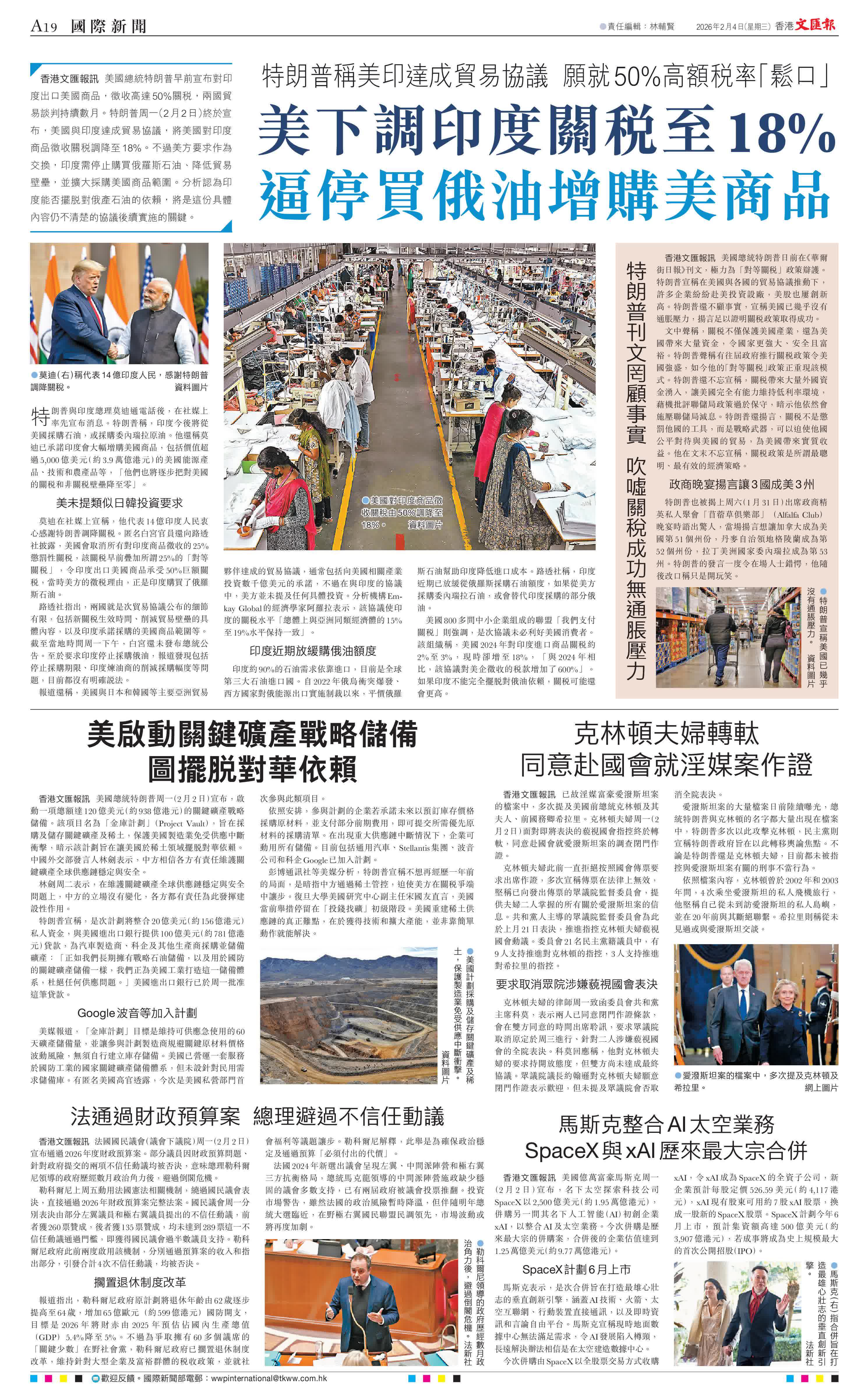香港文匯報訊 美國總統特朗普早前宣布對印度出口美國商品,徵收高達50%關稅,兩國貿易談判持續數月。特朗普周一(2月2日)終於宣布,美國與印度達成貿易協議,將美國對印度商品徵收關稅調降至18%。不過美方要求作為交換,印度需停止購買俄羅斯石油、降低貿易壁壘,並擴大採購美國商品範圍。分析認為印度能否擺脫對俄產石油的依賴,將是這份具體內容仍不清楚的協議後續實施的關鍵。