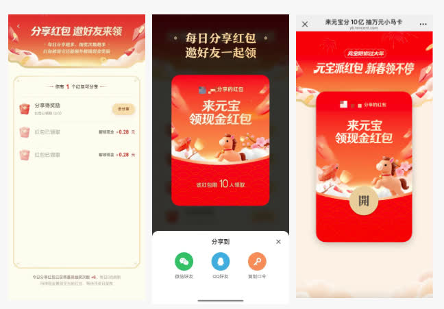在此背景下,我們收到用戶針對元寶的反饋和投訴,其相關春節營銷活動存在通過「做任務」「領紅包」等方式誘導用戶高頻分享鏈接到微信群等場景,干擾平台生態秩序、影響用戶體驗、對用戶造成騷擾。