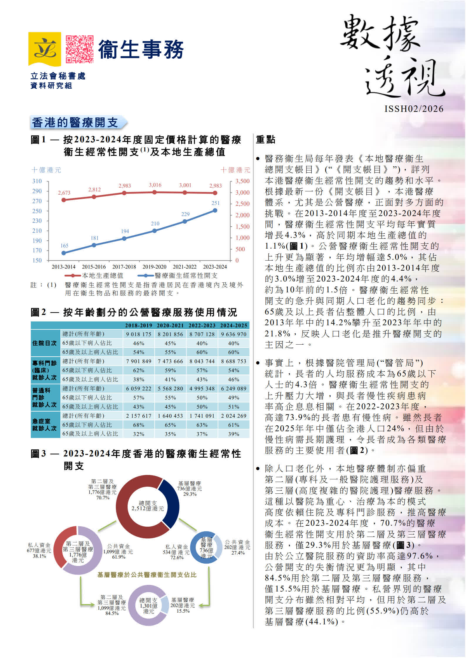 立法會議員及立法會轄下委員會編製的《數據透視》本期根據醫務衞生局最新的《本地醫療衞生總開支帳目》,分析本港醫療衞生經常性開支趨勢和水平,主要觀察包括: