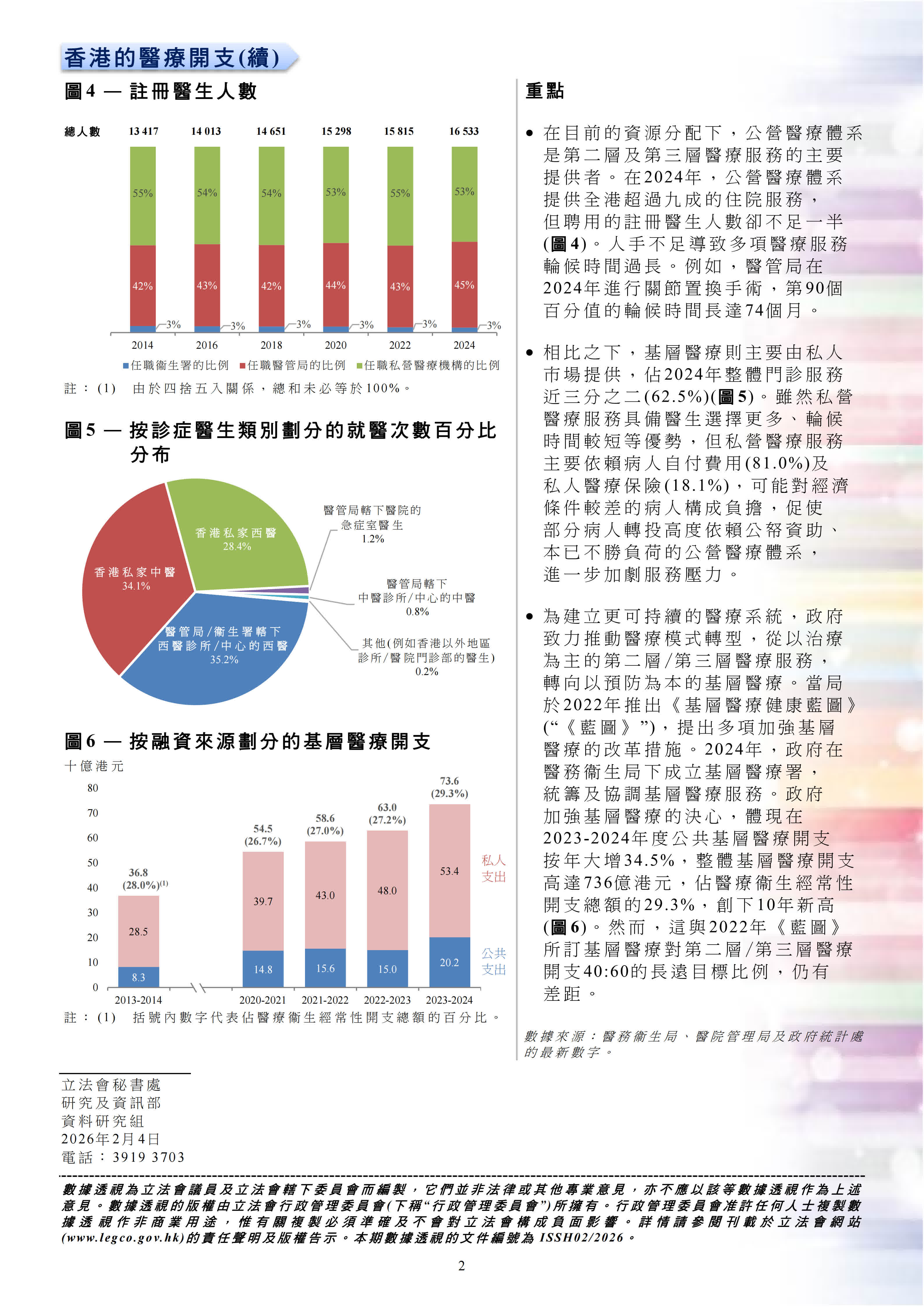 - 公營服務壓力沉重:公營體系提供全港九成的住院服務,但僅聘用不足一半的註冊醫生,導致醫療服務輪候時間漫長。