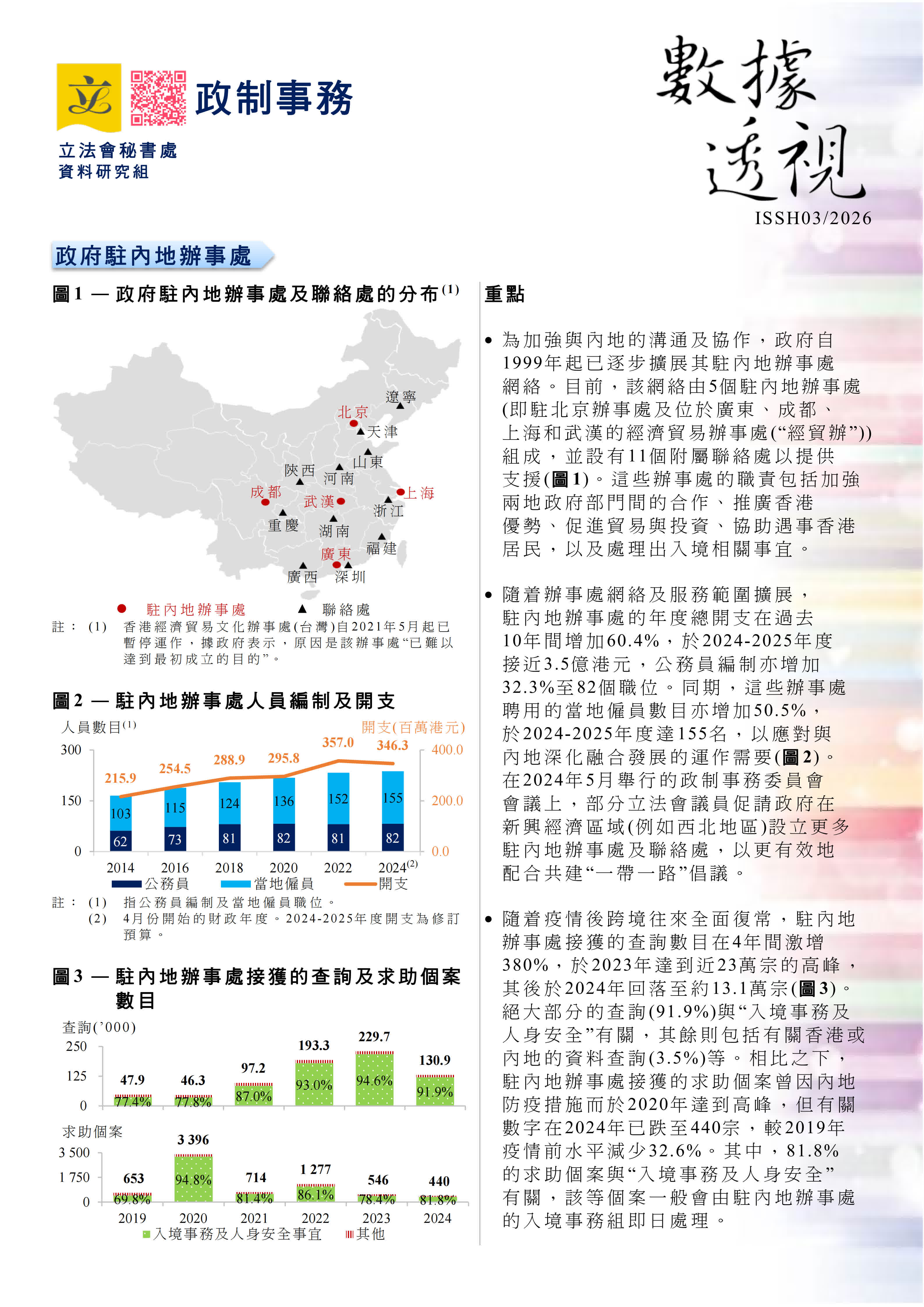 近年,隨着跨境融合發展持續深化,特區政府駐內地辦事處的開支規模及人員編制亦見增加。近年,有關辦事處亦積極協助內地企業透過香港「出海」拓展全球業務,成效顯著。立法會議員及立法會轄下委員會編製的《數據透視》本期羅列駐內地辦事處的最新相關數字,主要觀察包括: