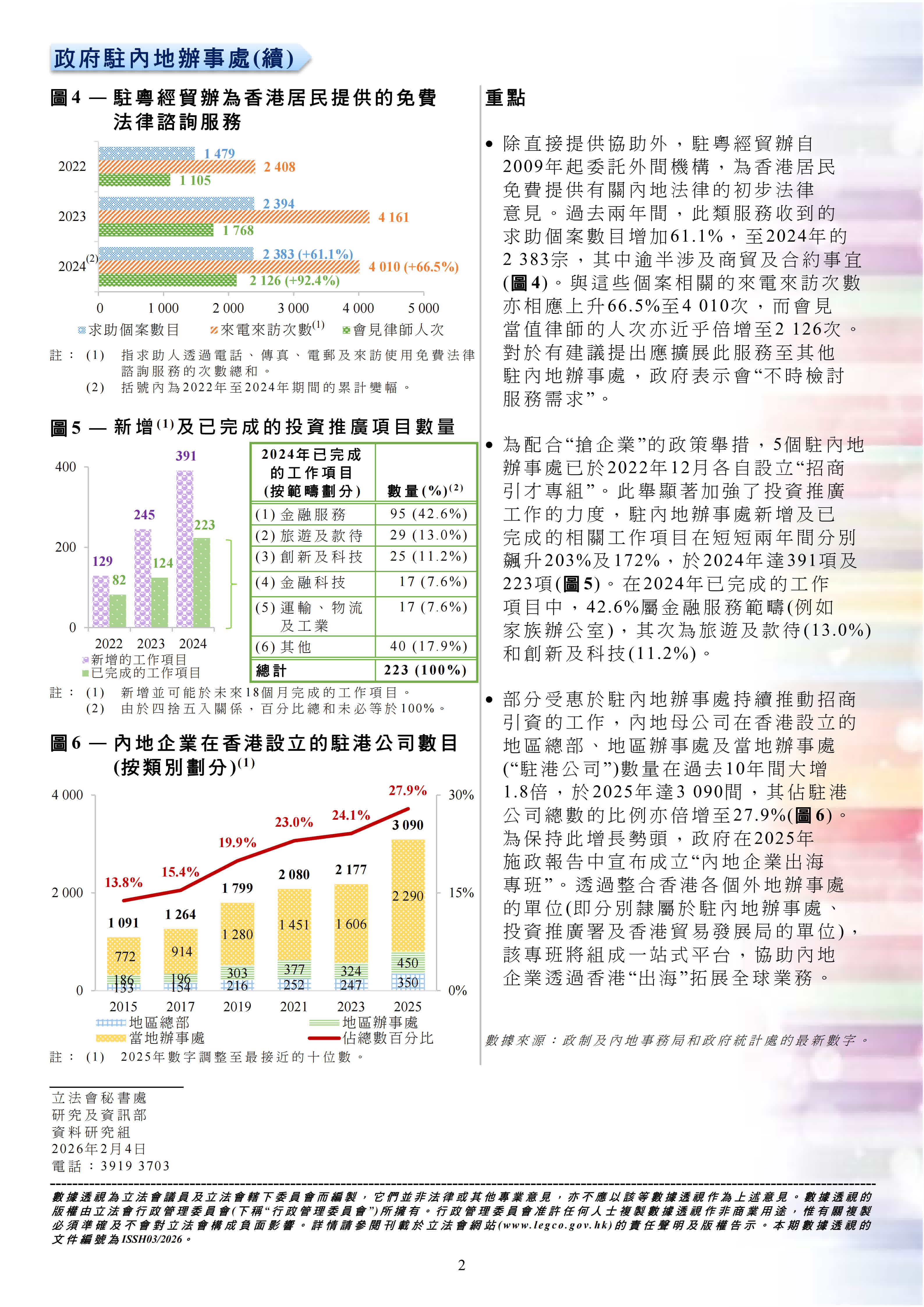 - 加強投資推廣:在設立「招商引才專組」後,駐內地辦事處新增及完成的投資推廣項目飆升,於2024年分別達391項及223項,某程度上帶動了更多內地企業來港設立地區總部及辦事處。