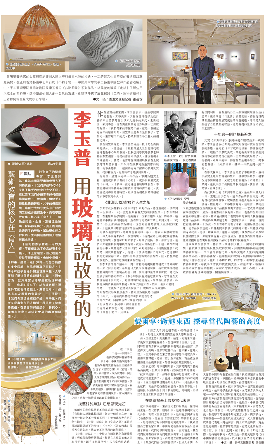 當玻璃藝術家的心靈捕捉到非洲大陸上塑料袋與水源的相遇,一次跨越文化與時空的藝術對話就此展開。在正於香港藝術中心舉行的「不物于物——中國美術學院手工藝術學院教師作品香港展」中,手工藝術學院書記兼副院長李玉普的《非洲印象》系列作品,以晶瑩的玻璃「定格」了那些用以取水的塑料袋。這不僅是他個人創作哲思的凝練,更精準呼應了展覽探討「工巧、器物與精神」三者如何相生互成的核心命題。