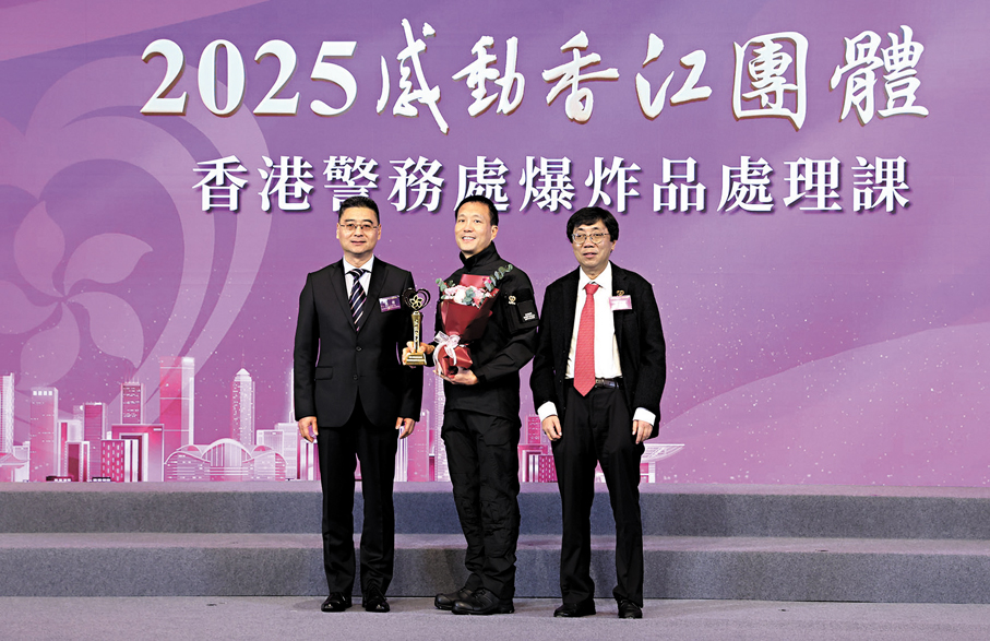 警務處爆炸品處理課這份不畏艱險、專業敬業的精神,讓團隊獲選為「2025感動香江團隊」之一。代表團隊領獎的炸彈處理主任黎遨遊表示,感謝警務處嚴格多元的訓練,正是訓練與經驗的累積,讓隊員能將複雜問題「逐步拆解」:每完成一小步驟即專注觀察、即時評估,再決定下一步,透過不斷分析推進,直至化解全局。面對貼近民居的現場,他最牽掛的是居民疏散及未來24小時起居飲食安置,最難忘是各部門迅速配合,在短時間內完成疏散並妥善照顧受影響市民。