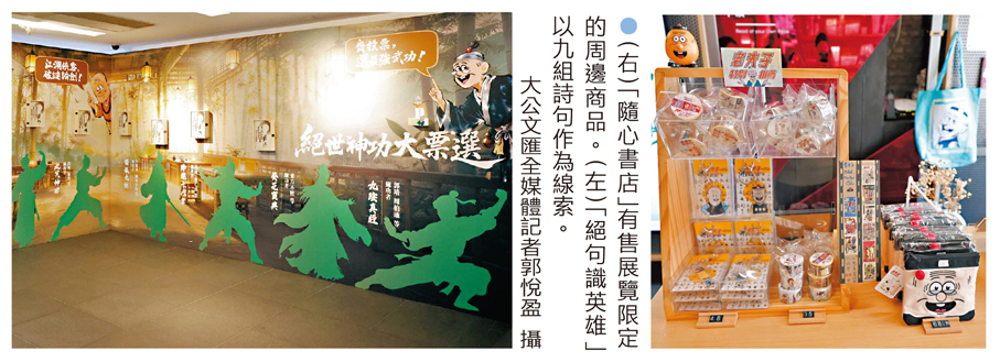 二樓「江湖試煉場」以「文武雙全」為概念,設有兩項互動體驗。「絕句識英雄」以九組詩句作為線索,觀眾可打開對應的盒子查看答案,辨識武俠小說中的經典人物,從閱讀、記憶與流行文化的角度,重新感受武俠小說的魅力。觀眾還可參與「絕世神功大票選」活動,討論心目中的「天下第一」武功。