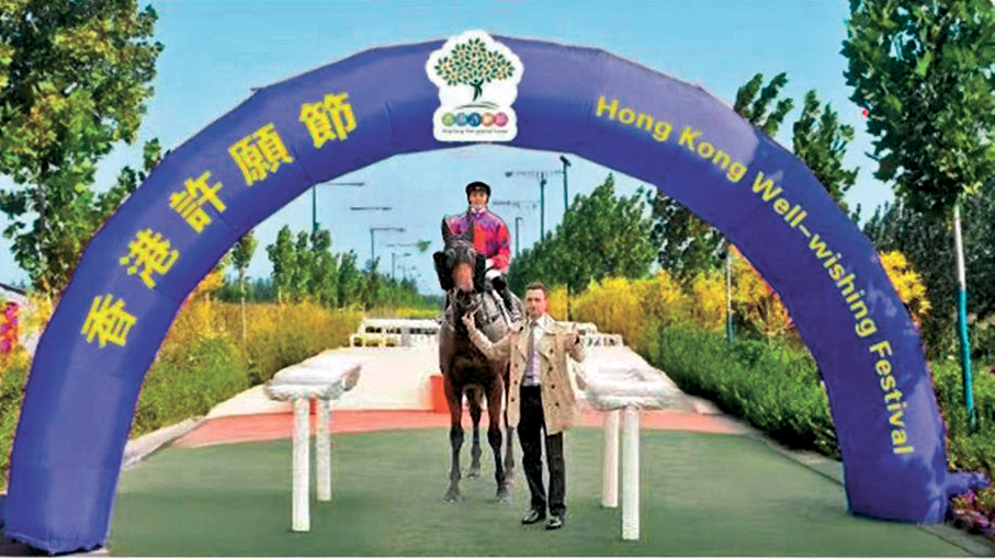 駿馬元素方面,除了兩隻馬匹模型及凱旋門裝置外,為祝賀勇奪澳洲珠穆朗瑪峰錦標賽冠軍的本港馬王「嘉應高昇」,活動亦將在年初一揭幕該馬王的巨型油畫,還設有大熊貓壁畫,供市民打卡留念。