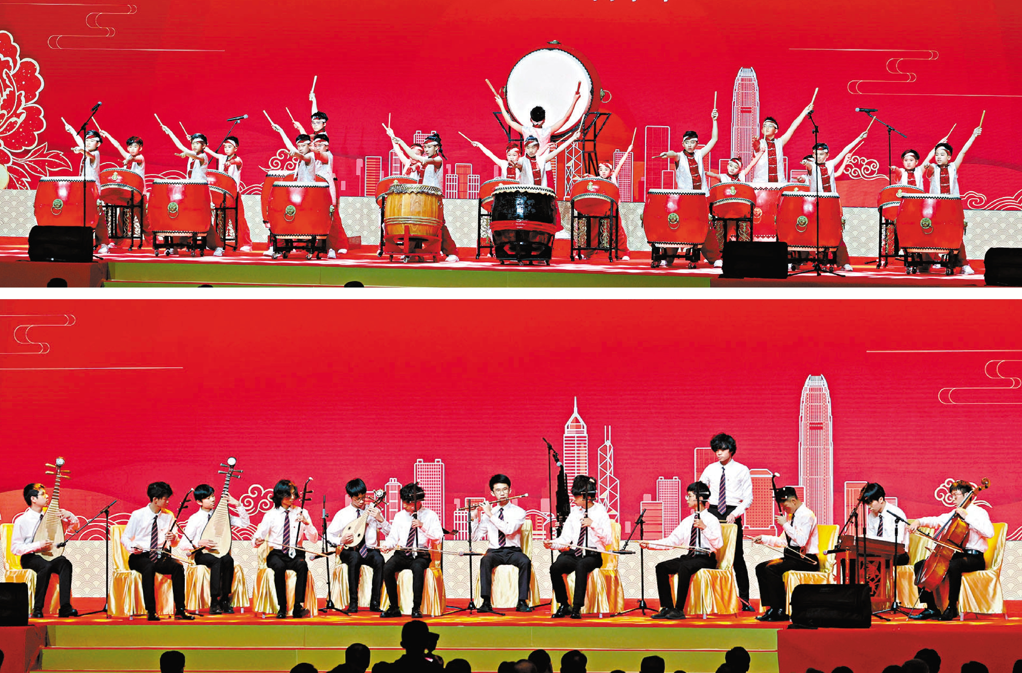 到文藝表演環節,滬江小學鼓樂團率先帶來精彩表演,21名小四至小六的少年樂手合奏鼓曲《萬馬歡騰》,鼓聲如萬馬奔騰,馬踏聲連綿不絕,展現香港青少年志氣昂揚、馳騁未來的勃勃生機。