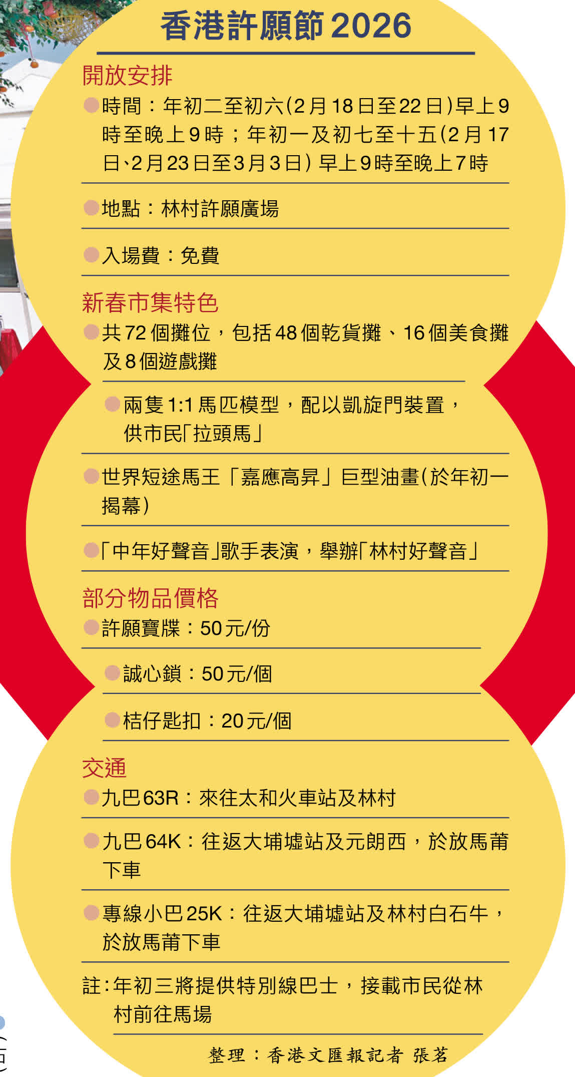 (香港文匯報記者 張茗)作為新春重頭戲的香港許願節,今年將於大年初一(17日)至十五日(3月3日)於大埔林村許願廣場舉行。除了傳統的拋寶牒許願和新春市集外,今年大會將布置發光許願樹及夜市等,廣場更會展出兩隻由馬會借出的一比一馬匹模型,以及凱旋門裝置,供市民體驗「拉頭馬」樂趣。林村許願廣場主席鄭倫光指出,香港許願節今年亦將首次派出一輛花車,參與年初一晚上的國際新春匯演之夜花車巡遊,花車其後會在林村展出,相信在花車效應及眾多駿馬元素打卡點的加持下,將可吸引更多遊客。