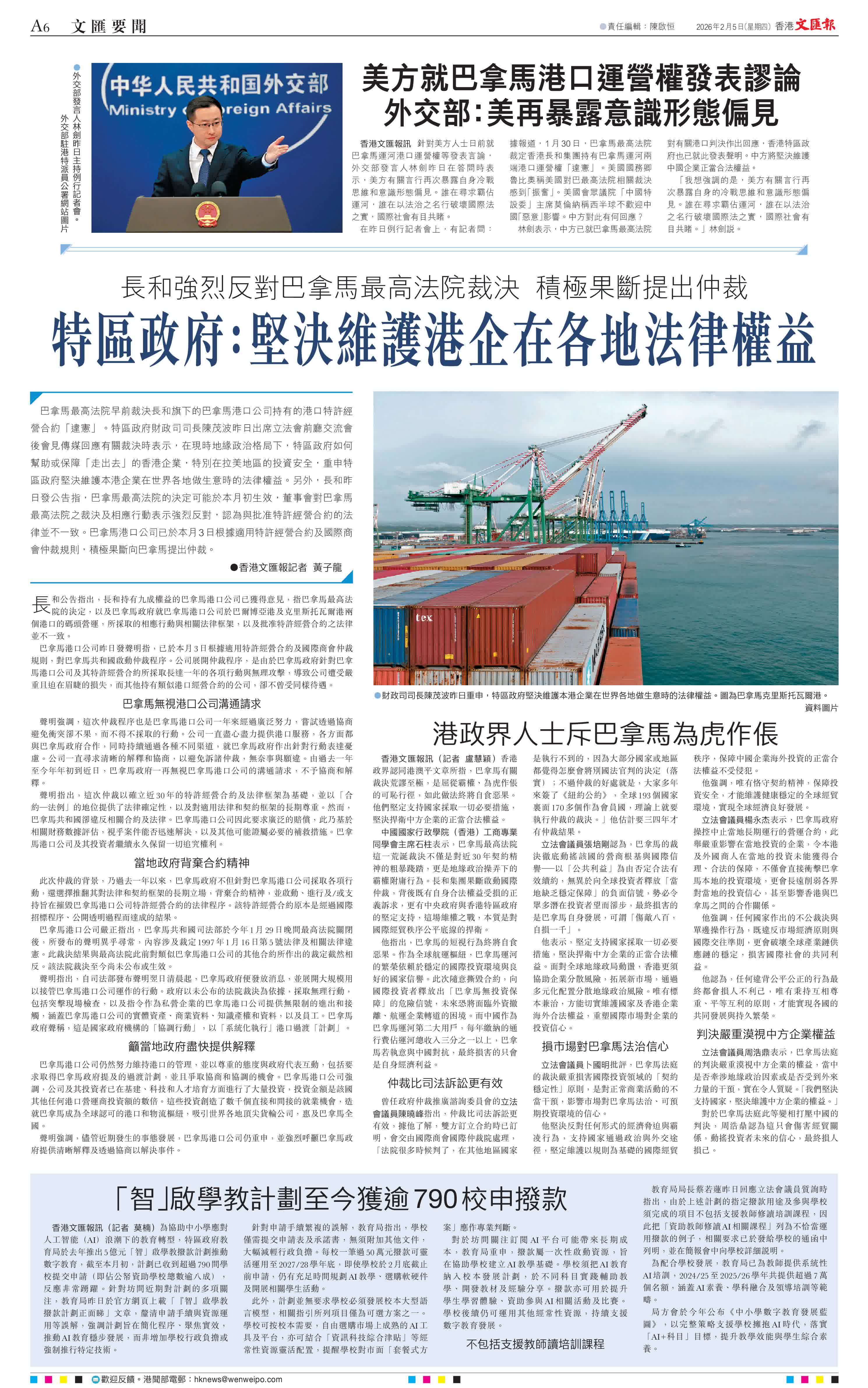 (香港文匯報記者 黃子龍)巴拿馬最高法院早前裁決長和旗下的巴拿馬港口公司持有的港口特許經營合約「違憲」。特區政府財政司司長陳茂波昨日出席立法會前廳交流會後會見傳媒回應有關裁決時表示,在現時地緣政治格局下,特區政府如何幫助或保障「走出去」的香港企業,特別在拉美地區的投資安全,重申特區政府堅決維護本港企業在世界各地做生意時的法律權益。另外,長和昨日發公告指,巴拿馬最高法院的決定可能於本月初生效,董事會對巴拿馬最高法院之裁決及相應行動表示強烈反對,認為與批准特許經營合約的法律並不一致。巴拿馬港口公司已於本月3日根據適用特許經營合約及國際商會仲裁規則,積極果斷向巴拿馬提出仲裁。