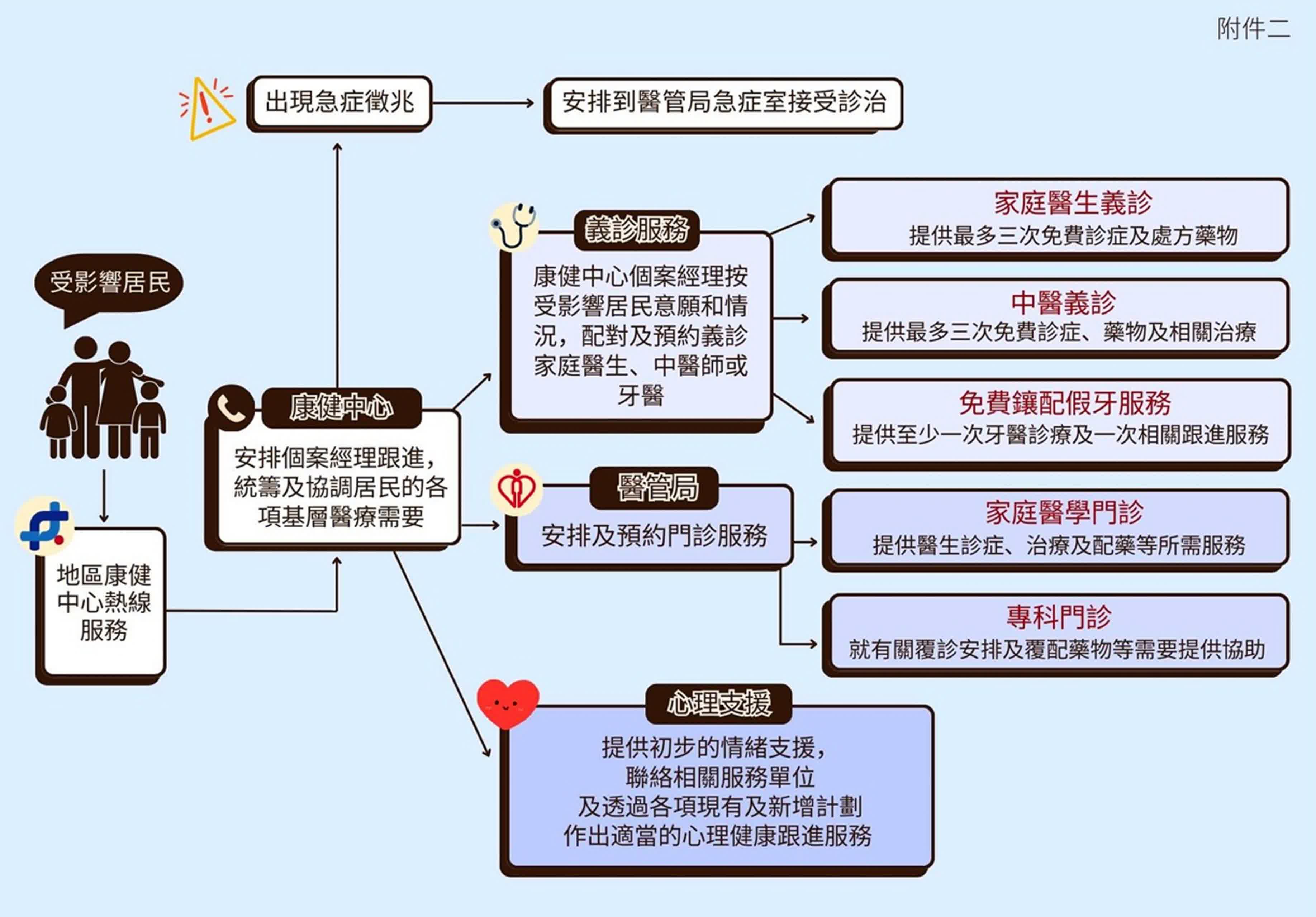 醫衞局強調,會繼續為受影響居民提供全面基層醫療支援,並從居民的角度設計相關服務流程,讓他們只需透過康健中心便可獲得便捷及到位的醫療支援(詳見附件二)。