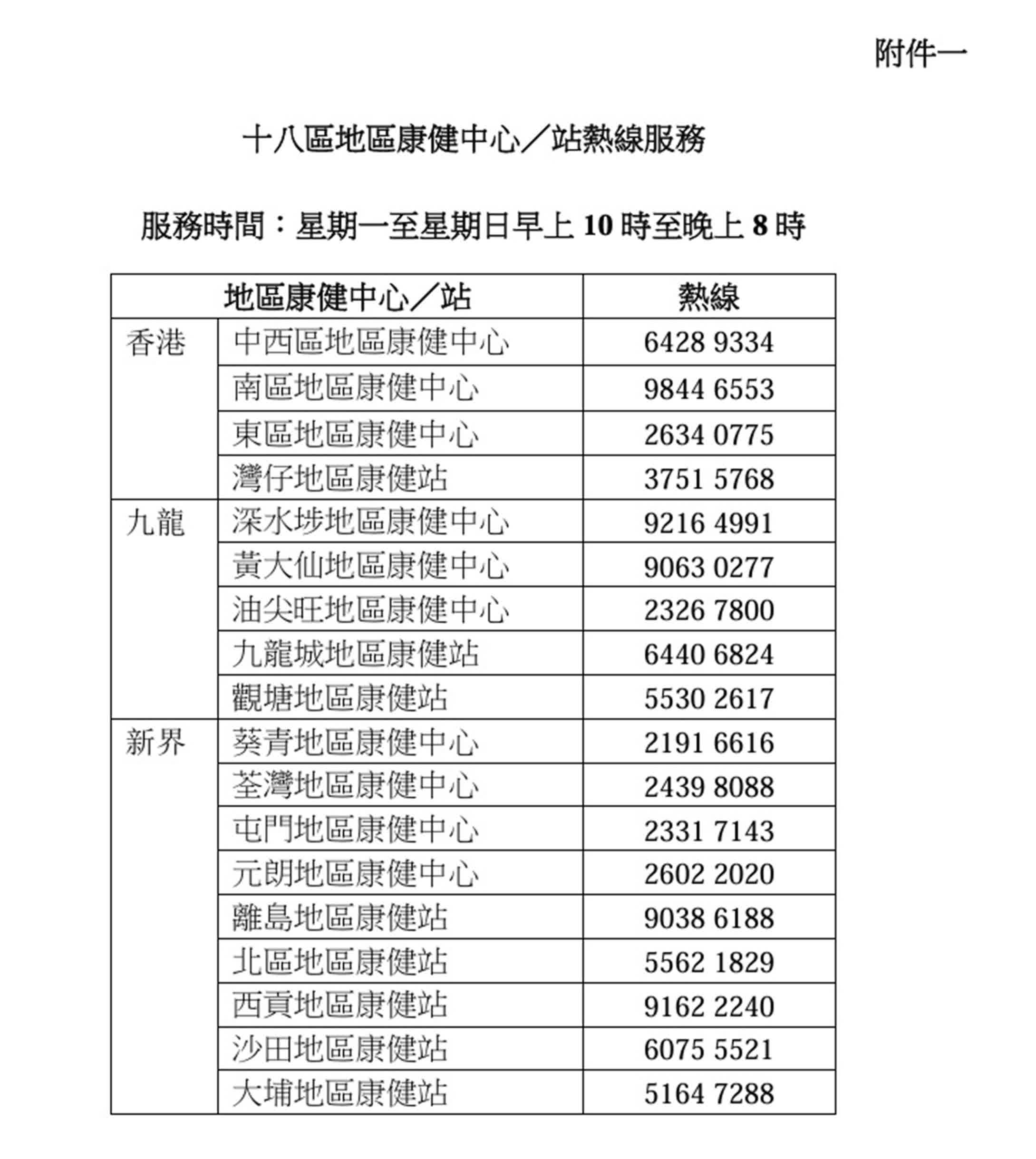 基層醫療署統籌全港十八區康健中心自去年12月1日起設立熱線(詳見附件一),為受影響居民安排個人化個案管理服務,提供更便捷和全面的醫療支援,包括配對私營醫療界別家庭醫生及中醫師義診、按需要協調醫院管理局(醫管局)家庭醫學門診的覆診安排及覆配藥物事宜、轉介接受所需醫療、護理和藥物服務,以及心理支援。