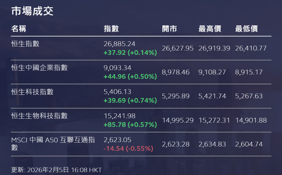 香港文匯報訊 港股整體走勢續橫行,不過尾市見支持,三大指數齊齊收升,表現改善。恒生指數(恒指)收報26,885點,升37點或0.14%。國企指數升0.50%。恒生科技指數升0.74%。大市成交額回升至3,151.12億元。值得關注的是,恒指今數度下探至26,400點附近後皆見支持,午市顯著回升,反映資金仍有意願入市「撈底」。