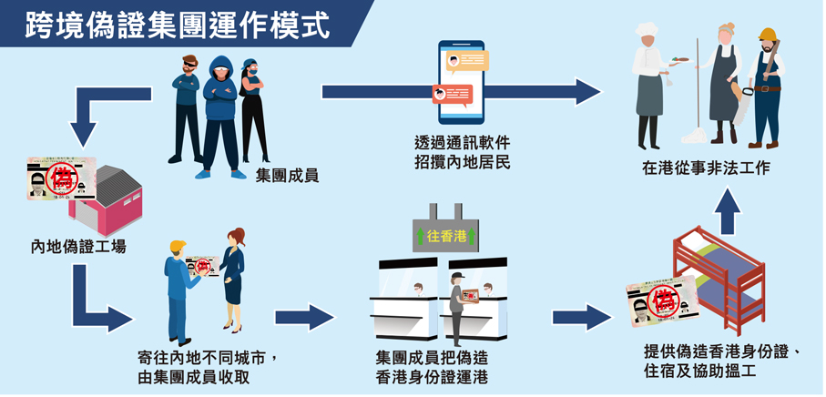 該犯罪集團替擬來香港打黑工的內地居民偽造香港身份證,並將假證寄往內地不同城巿,然後安排集團成員收件及運往香港,在過關時把假證藏在鞋底等隱蔽地方,意圖逃避口岸執法人員檢查。在內地居民以遊客身份來港後,集團成員會將假身份證分發給他們,並提供宿舍及協助他們使用假身份證求職;每張假香港身份證收取約3,200元,宿舍床位每月收費約1,600至1,800元不等,黑工主要從事洗碗、清潔工、麵包師傅、藥房雜工等。