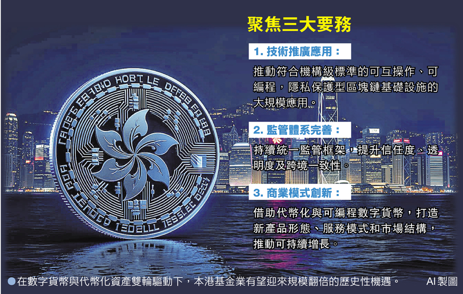 由波士頓諮詢公司(BCG)與Aptos Labs聯合發布、恒生銀行提供重要支持的最新白皮書《數字貨幣:香港基金行業倍增式發展機遇》指出,在數字貨幣與代幣化資產雙輪驅動下,本港基金業有望迎來規模翻倍的歷史性機遇。報告並認為,香港作為連接中國內地與國際市場的重要通道,擁有引領代幣化體系轉型的優越條件,建議本港聚焦三大方向增強競爭力,包括技術推廣應用、完善監管體系,及借助商業模式創新,以確立香港在代幣化金融領域的全球標杆地位。