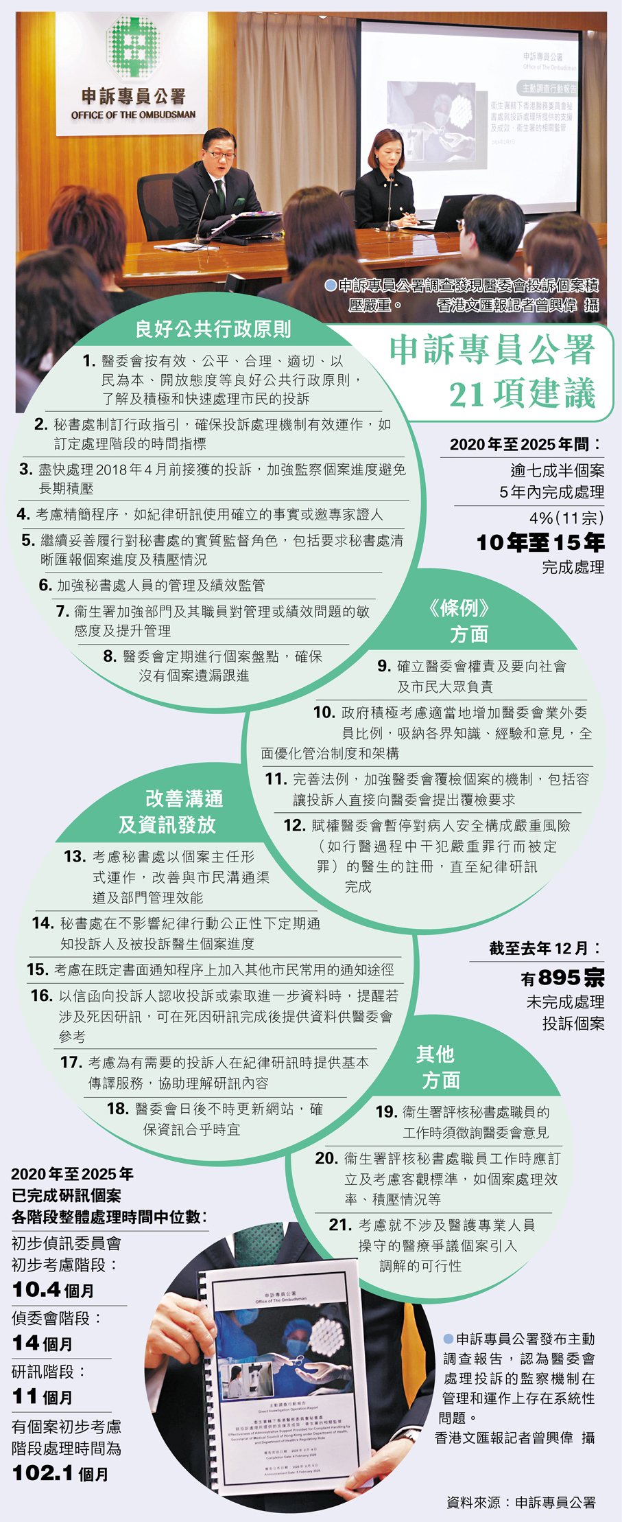 去年一宗腦癱嬰兒家屬投訴被拖延15年才進行紀律研訊,香港醫務委員會以個案處理時間太長一度永久擱置研訊,引起各界高度關注。特區政府申訴專員公署主動調查醫委會處理投訴的監察機制,發現自2020年起,最少11宗投訴需時10年至15年才完成處理,認為醫委會處理投訴的監察機制在管理和運作上存在系統性問題及不足,要迫切檢討並徹底改善流程。公署提出21項建議,包括加強秘書處人員管理與績效監管和改善溝通及資訊發放,同時精簡程序,如採用法庭審訊中已確立事實節省處理時間,又建議修訂法例賦權醫委會暫停對病人安全構成嚴重風險的醫生註冊,直至完成研訊。