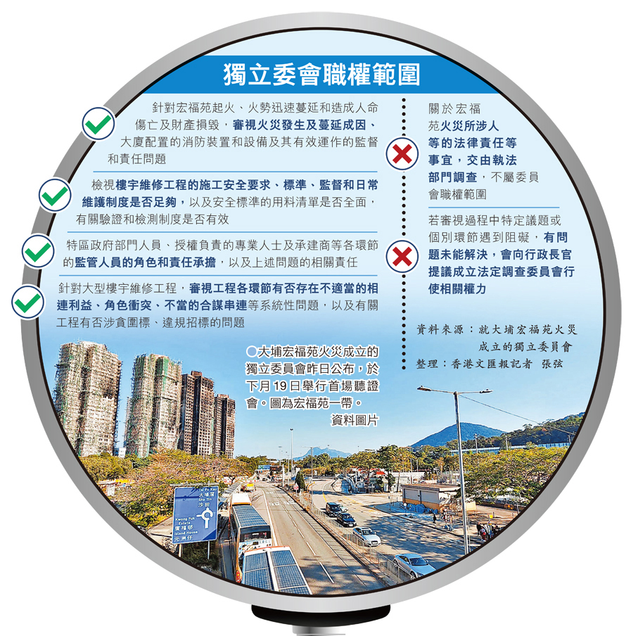 (香港文匯報記者 張弦)香港特區政府就大埔宏福苑火災成立的獨立委員會昨日上午舉行指示會議,就委員會日後進行聽證會時的安排給予指示,包括確定有意出席日後聽證會的人士、機構或其法律代表等,並公布將於下月19日舉行首場聽證會。委員會首席代表大律師杜淦堃會上透露,根據目前接收的資料等綜合分析,已掌握到火災成因等方面的關鍵證據,顯示存在一系列的結構性問題,是不能接受和不能忽視,需要在聽證會向公眾披露並解釋。委員會主席陸啟康強調,委員會核心調查方向主要分為兩大方面,首先是宏福苑火災成因、蔓延及造成傷亡的相關問題,其次是大型樓宇維修工程各環節是否存在涉貪及圍標等問題,並圍繞這兩大方向檢視現行相關法律的規管以及懲罰是否足夠,提出相應建議。