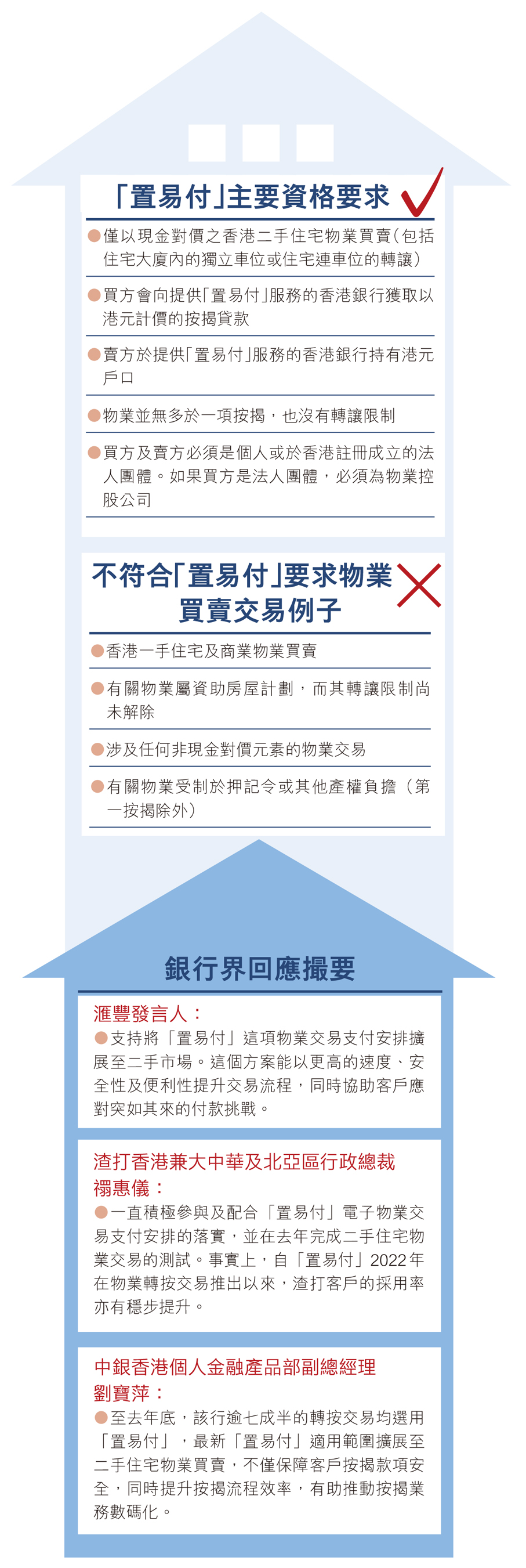 他補充,為確保「置易付」可順利推行,銀行業界於去年第二季度開展試點計劃,邀請按揭客戶與律師樓共同參與,採用這一付款方案支付物業交易款項,該試點計劃於第三季度順利完成,所有個案交易均成功完成,進一步印證方案的可行性,為「置易付」服務或二手住宅物業買賣交易提供堅實的基礎和信心。